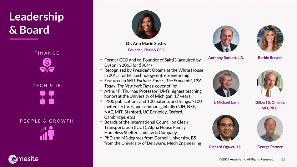 12 TEC H & I P FIN A N C E PE O PL E & G R O W T H Dr. Ann Marie Sastry Founder, Chair & CEO Anthony Barkett, J.D. Barbie Brewer J. Michael Losh Richard Ogawa, J.D. Gilbert S. Omenn, MD, Ph.D. George Parmer • Former CEO and co - Founder of Sakti3 (acquired by Dyson in 2015 for $90M) • Recognized by President Obama at the White House in 2015 for her technology entrepreneurship • Featured in WSJ, Fortune, Forbes, The Economist, USA Today, The New York Times ; cover of Inc. • Arthur F. Thurnau Professor (UM’s highest teaching honor) at the University of Michigan, 17 years • >100 publications and 100 patents and filings. >100 invited lectures and seminars globally (NIH, NSF, NAE, MIT, Stanford, UC Berkeley, Oxford, Cambridge, etc.) • Boards of the International Council on Clean Transportation (ICCT), Alpha House Family Homeless Shelter, Laidlaw & Company • PhD and MS degrees from Cornell University, BS from the University of Delaware, Mech Engineering Leadership & Board © 2024 Amesite Inc. All Rights Reserved.