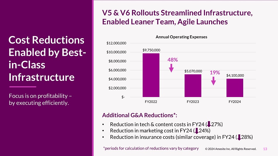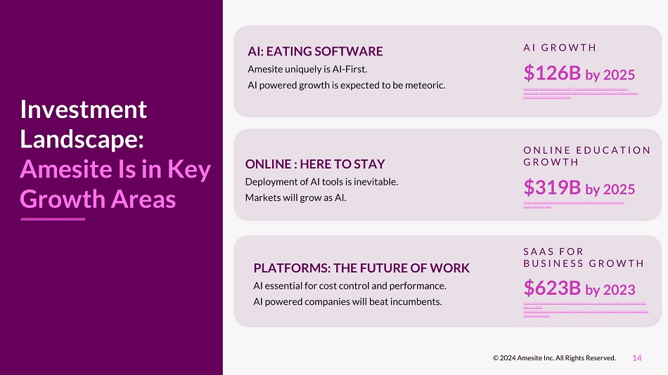 V5 & V6 Rollouts Streamlined Infrastructure, Enabled Leaner Team, Agile Launches Cost Reductions Enabled by Best - in - Class Infrastructure 27%) • Reduction in insurance costs (similar coverage) in FY24 ( 28%) Focus is on profitability – by executing efficiently. 13 © 2024 Amesite Inc. All Rights Reserved. *periods for calculation of reductions vary by category $9,750,000 $5,070,000 $4,100,000 $ - $2,000,000 $4,000,000 $6,000,000 $8,000,000 $10,000,000 $12,000,000 FY2022 FY2023 Additional G&A Reductions*: • Reduction in tech & content costs in FY24 ( • Reduction in marketing cost in FY24 ( 24%) FY2024 Annual Operating Expenses 48% 19%