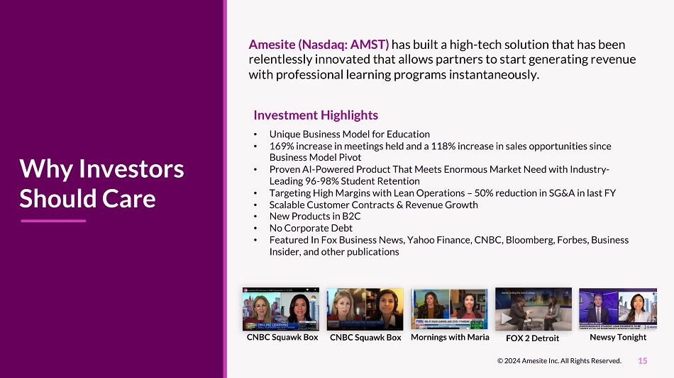 Why Investors Should Care Amesite (Nasdaq: AMST) has built a high - tech solution that has been relentlessly innovated that allows partners to start generating revenue with professional learning programs instantaneously. Investment Highlights • Unique Business Model for Education • 169% increase in meetings held and a 118% increase in sales opportunities since Business Model Pivot • Proven AI - Powered Product That Meets Enormous Market Need with Industry - Leading 96 - 98% Student Retention • Targeting High Margins with Lean Operations – 50% reduction in SG&A in last FY • Scalable Customer Contracts & Revenue Growth • New Products in B2C • No Corporate Debt • Featured In Fox Business News, Yahoo Finance, CNBC, Bloomberg, Forbes, Business Insider, and other publications CNBC Squawk Box CNBC Squawk Box Mornings with Maria FOX 2 Detroit Newsy Tonight 15 © 2024 Amesite Inc. All Rights Reserved.