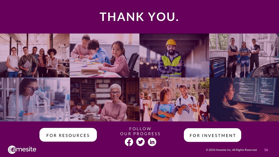 THANK YOU. FOL L OW OU R P R OG R E SS FOR R E SOU R C E S FOR IN V E ST M E N T 16 © 2024 Amesite Inc. All Rights Reserved.