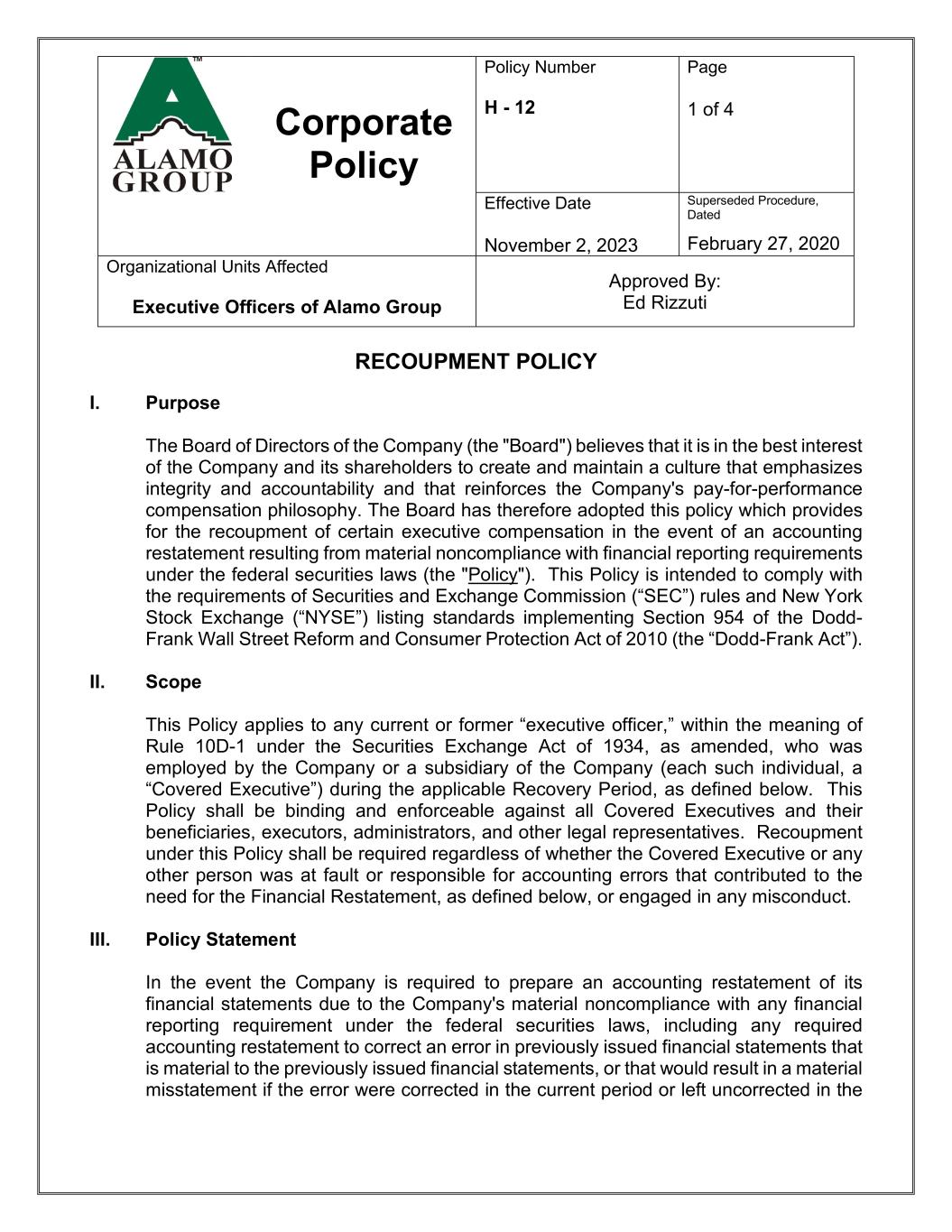 Corporate Policy Policy Number H - 12 Page 1 of 4 Effective Date November 2, 2023 Superseded Procedure, Dated February 27, 2020 Organizational Units Affected Executive Officers of Alamo Group Approved By: Ed Rizzuti RECOUPMENT POLICY I. Purpose The Board of Directors of the Company (the "Board") believes that it is in the best interest of the Company and its shareholders to create and maintain a culture that emphasizes integrity and accountability and that reinforces the Company's pay-for-performance compensation philosophy. The Board has therefore adopted this policy which provides for the recoupment of certain executive compensation in the event of an accounting restatement resulting from material noncompliance with financial reporting requirements under the federal securities laws (the "Policy"). This Policy is intended to comply with the requirements of Securities and Exchange Commission (“SEC”) rules and New York Stock Exchange (“NYSE”) listing standards implementing Section 954 of the Dodd- Frank Wall Street Reform and Consumer Protection Act of 2010 (the “Dodd-Frank Act”). II. Scope This Policy applies to any current or former “executive officer,” within the meaning of Rule 10D-1 under the Securities Exchange Act of 1934, as amended, who was employed by the Company or a subsidiary of the Company (each such individual, a “Covered Executive”) during the applicable Recovery Period, as defined below. This Policy shall be binding and enforceable against all Covered Executives and their beneficiaries, executors, administrators, and other legal representatives. Recoupment under this Policy shall be required regardless of whether the Covered Executive or any other person was at fault or responsible for accounting errors that contributed to the need for the Financial Restatement, as defined below, or engaged in any misconduct. III. Policy Statement In the event the Company is required to prepare an accounting restatement of its financial statements due to the Company's material noncompliance with any financial reporting requirement under the federal securities laws, including any required accounting restatement to correct an error in previously issued financial statements that is material to the previously issued financial statements, or that would result in a material misstatement if the error were corrected in the current period or left uncorrected in the