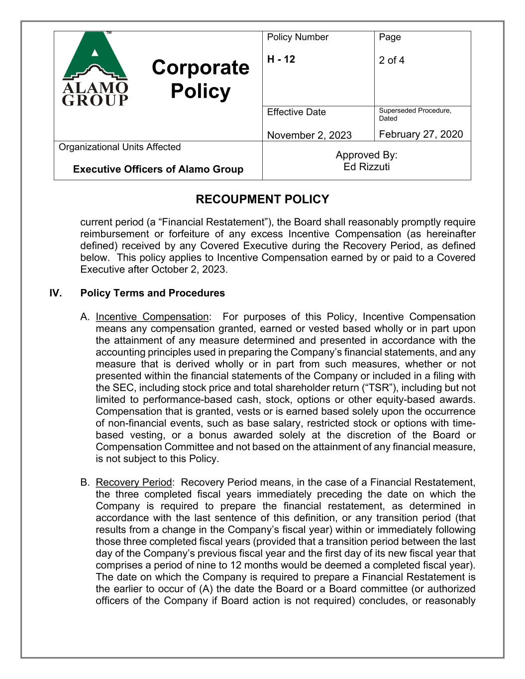 Corporate Policy Policy Number H - 12 Page 2 of 4 Effective Date November 2, 2023 Superseded Procedure, Dated February 27, 2020 Organizational Units Affected Executive Officers of Alamo Group Approved By: Ed Rizzuti RECOUPMENT POLICY current period (a “Financial Restatement”), the Board shall reasonably promptly require reimbursement or forfeiture of any excess Incentive Compensation (as hereinafter defined) received by any Covered Executive during the Recovery Period, as defined below. This policy applies to Incentive Compensation earned by or paid to a Covered Executive after October 2, 2023. IV. Policy Terms and Procedures A. Incentive Compensation: For purposes of this Policy, Incentive Compensation means any compensation granted, earned or vested based wholly or in part upon the attainment of any measure determined and presented in accordance with the accounting principles used in preparing the Company’s financial statements, and any measure that is derived wholly or in part from such measures, whether or not presented within the financial statements of the Company or included in a filing with the SEC, including stock price and total shareholder return (“TSR”), including but not limited to performance-based cash, stock, options or other equity-based awards. Compensation that is granted, vests or is earned based solely upon the occurrence of non-financial events, such as base salary, restricted stock or options with time- based vesting, or a bonus awarded solely at the discretion of the Board or Compensation Committee and not based on the attainment of any financial measure, is not subject to this Policy. B. Recovery Period: Recovery Period means, in the case of a Financial Restatement, the three completed fiscal years immediately preceding the date on which the Company is required to prepare the financial restatement, as determined in accordance with the last sentence of this definition, or any transition period (that results from a change in the Company’s fiscal year) within or immediately following those three completed fiscal years (provided that a transition period between the last day of the Company’s previous fiscal year and the first day of its new fiscal year that comprises a period of nine to 12 months would be deemed a completed fiscal year). The date on which the Company is required to prepare a Financial Restatement is the earlier to occur of (A) the date the Board or a Board committee (or authorized officers of the Company if Board action is not required) concludes, or reasonably