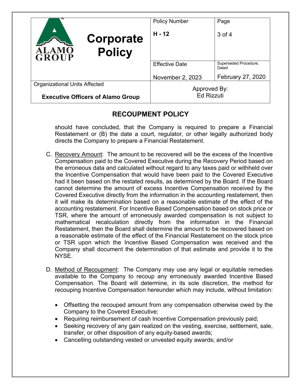 Corporate Policy Policy Number H - 12 Page 3 of 4 Effective Date November 2, 2023 Superseded Procedure, Dated February 27, 2020 Organizational Units Affected Executive Officers of Alamo Group Approved By: Ed Rizzuti RECOUPMENT POLICY should have concluded, that the Company is required to prepare a Financial Restatement or (B) the date a court, regulator, or other legally authorized body directs the Company to prepare a Financial Restatement. C. Recovery Amount: The amount to be recovered will be the excess of the Incentive Compensation paid to the Covered Executive during the Recovery Period based on the erroneous data and calculated without regard to any taxes paid or withheld over the Incentive Compensation that would have been paid to the Covered Executive had it been based on the restated results, as determined by the Board. If the Board cannot determine the amount of excess Incentive Compensation received by the Covered Executive directly from the information in the accounting restatement, then it will make its determination based on a reasonable estimate of the effect of the accounting restatement. For Incentive Based Compensation based on stock price or TSR, where the amount of erroneously awarded compensation is not subject to mathematical recalculation directly from the information in the Financial Restatement, then the Board shall determine the amount to be recovered based on a reasonable estimate of the effect of the Financial Restatement on the stock price or TSR upon which the Incentive Based Compensation was received and the Company shall document the determination of that estimate and provide it to the NYSE. D. Method of Recoupment: The Company may use any legal or equitable remedies available to the Company to recoup any erroneously awarded Incentive Based Compensation. The Board will determine, in its sole discretion, the method for recouping Incentive Compensation hereunder which may include, without limitation: • Offsetting the recouped amount from any compensation otherwise owed by the Company to the Covered Executive; • Requiring reimbursement of cash Incentive Compensation previously paid; • Seeking recovery of any gain realized on the vesting, exercise, settlement, sale, transfer, or other disposition of any equity-based awards; • Cancelling outstanding vested or unvested equity awards; and/or