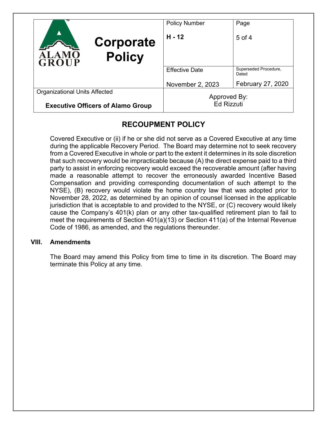 Corporate Policy Policy Number H - 12 Page 5 of 4 Effective Date November 2, 2023 Superseded Procedure, Dated February 27, 2020 Organizational Units Affected Executive Officers of Alamo Group Approved By: Ed Rizzuti RECOUPMENT POLICY Covered Executive or (ii) if he or she did not serve as a Covered Executive at any time during the applicable Recovery Period. The Board may determine not to seek recovery from a Covered Executive in whole or part to the extent it determines in its sole discretion that such recovery would be impracticable because (A) the direct expense paid to a third party to assist in enforcing recovery would exceed the recoverable amount (after having made a reasonable attempt to recover the erroneously awarded Incentive Based Compensation and providing corresponding documentation of such attempt to the NYSE), (B) recovery would violate the home country law that was adopted prior to November 28, 2022, as determined by an opinion of counsel licensed in the applicable jurisdiction that is acceptable to and provided to the NYSE, or (C) recovery would likely cause the Company’s 401(k) plan or any other tax-qualified retirement plan to fail to meet the requirements of Section 401(a)(13) or Section 411(a) of the Internal Revenue Code of 1986, as amended, and the regulations thereunder. VIII. Amendments The Board may amend this Policy from time to time in its discretion. The Board may terminate this Policy at any time.