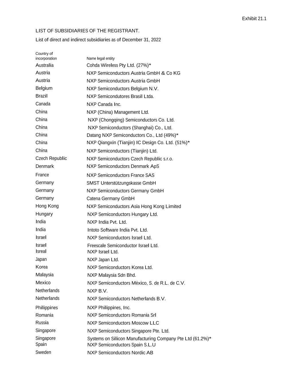 Exhibit 21.1 LIST OF SUBSIDIARIES OF THE REGISTRANT. List of direct and indirect subsidiaries as of December 31, 2022 Country of incorporation Name legal entity Australia Cohda Wireless Pty Ltd. (27%)* Austria NXP Semiconductors Austria GmbH & Co KG Austria NXP Semiconductors Austria GmbH Belgium NXP Semiconductors Belgium N.V. Brazil NXP Semicondutores Brasil Ltda. Canada NXP Canada Inc. China NXP (China) Management Ltd. China NXP (Chongqing) Semiconductors Co. Ltd. China NXP Semiconductors (Shanghai) Co., Ltd. China Datang NXP Semiconductors Co., Ltd (49%)* China NXP Qiangxin (Tianjin) IC Design Co. Ltd. (51%)* China NXP Semiconductors (Tianjin) Ltd. Czech Republic NXP Semiconductors Czech Republic s.r.o. Denmark NXP Semiconductors Denmark ApS France NXP Semiconductors France SAS Germany SMST Unterstützungskasse GmbH Germany NXP Semiconductors Germany GmbH Germany Catena Germany GmbH Hong Kong NXP Semiconductors Asia Hong Kong Limited Hungary NXP Semiconductors Hungary Ltd. India NXP India Pvt. Ltd. India Intoto Software India Pvt. Ltd. Israel NXP Semiconductors Israel Ltd. Israel Freescale Semiconductor Israel Ltd. Isreal NXP Israel Ltd. Japan NXP Japan Ltd. Korea NXP Semiconductors Korea Ltd. Malaysia NXP Malaysia Sdn Bhd. Mexico NXP Semiconductors México, S. de R.L. de C.V. Netherlands NXP B.V. Netherlands NXP Semiconductors Netherlands B.V. Philippines NXP Philippines, Inc. Romania NXP Semiconductors Romania Srl Russia NXP Semiconductors Moscow LLC Singapore NXP Semiconductors Singapore Pte. Ltd. Singapore Systems on Silicon Manufacturing Company Pte Ltd (61.2%)* Spain NXP Semiconductors Spain S.L.U Sweden NXP Semiconductors Nordic AB