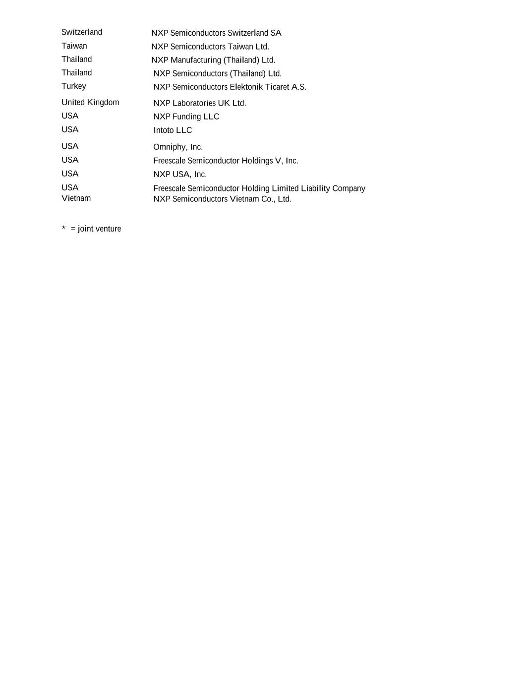 Switzerland NXP Semiconductors Switzerland SA Taiwan NXP Semiconductors Taiwan Ltd. Thailand NXP Manufacturing (Thailand) Ltd. Thailand NXP Semiconductors (Thailand) Ltd. Turkey NXP Semiconductors Elektonik Ticaret A.S. United Kingdom NXP Laboratories UK Ltd. USA NXP Funding LLC USA Intoto LLC USA Omniphy, Inc. USA Freescale Semiconductor Holdings V, Inc. USA NXP USA, Inc. USA Freescale Semiconductor Holding Limited Liability Company Vietnam NXP Semiconductors Vietnam Co., Ltd. * = joint venture
