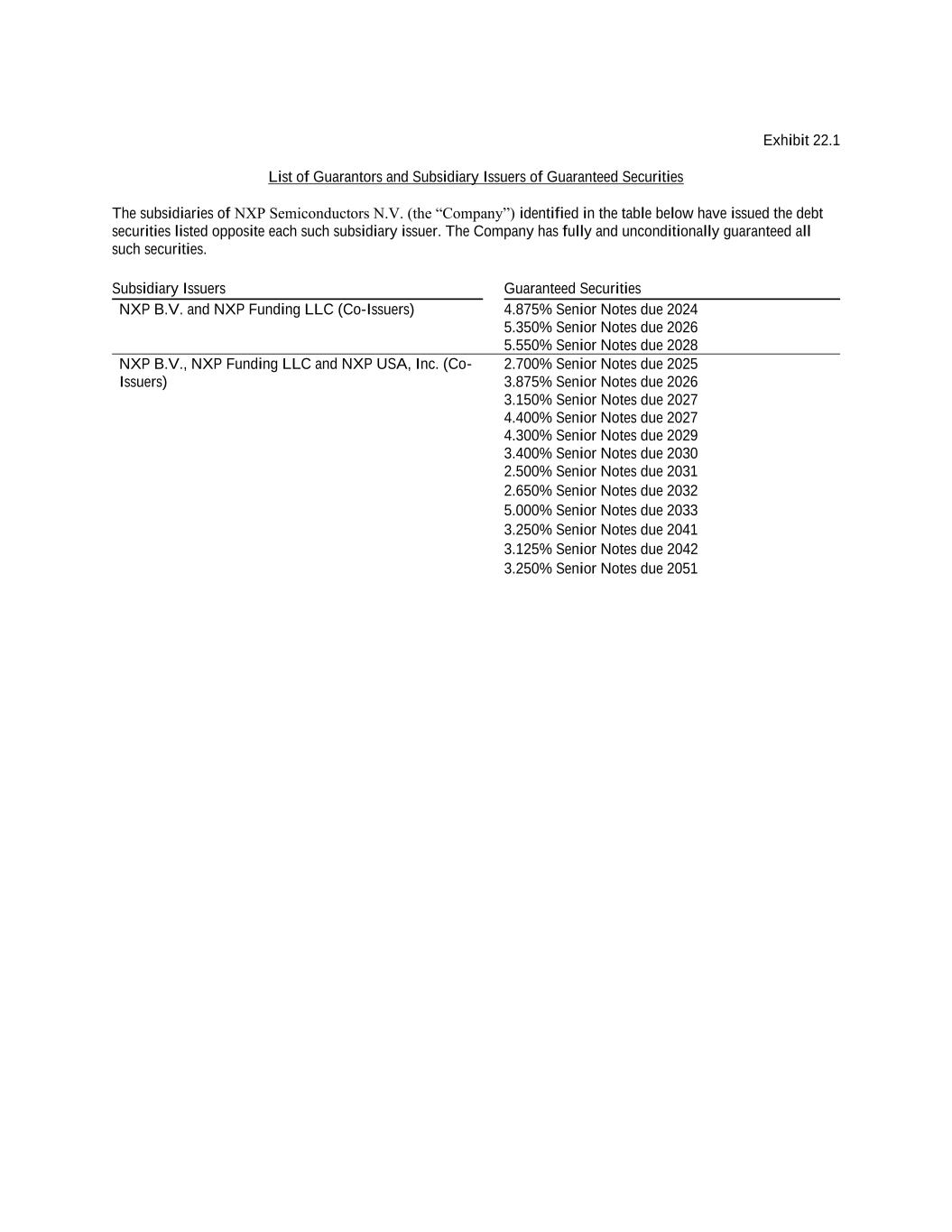 Exhibit 22.1 List of Guarantors and Subsidiary Issuers of Guaranteed Securities The subsidiaries of NXP Semiconductors N.V. (the “Company”) identified in the table below have issued the debt securities listed opposite each such subsidiary issuer. The Company has fully and unconditionally guaranteed all such securities. Subsidiary Issuers Guaranteed Securities NXP B.V. and NXP Funding LLC (Co-Issuers) 4.875% Senior Notes due 2024 5.350% Senior Notes due 2026 5.550% Senior Notes due 2028 NXP B.V., NXP Funding LLC and NXP USA, Inc. (Co- Issuers) 2.700% Senior Notes due 2025 3.875% Senior Notes due 2026 3.150% Senior Notes due 2027 4.400% Senior Notes due 2027 4.300% Senior Notes due 2029 3.400% Senior Notes due 2030 2.500% Senior Notes due 2031 2.650% Senior Notes due 2032 5.000% Senior Notes due 2033 3.250% Senior Notes due 2041 3.125% Senior Notes due 2042 3.250% Senior Notes due 2051