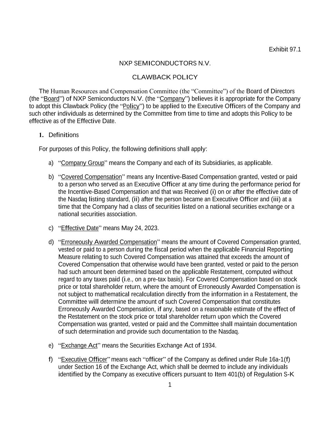 1 Exhibit 97.1 NXP SEMICONDUCTORS N.V. CLAWBACK POLICY The Human Resources and Compensation Committee (the “Committee”) of the Board of Directors (the “Board”) of NXP Semiconductors N.V. (the “Company”) believes it is appropriate for the Company to adopt this Clawback Policy (the “Policy”) to be applied to the Executive Officers of the Company and such other individuals as determined by the Committee from time to time and adopts this Policy to be effective as of the Effective Date. 1. Definitions For purposes of this Policy, the following definitions shall apply: a) “Company Group” means the Company and each of its Subsidiaries, as applicable. b) “Covered Compensation” means any Incentive-Based Compensation granted, vested or paid to a person who served as an Executive Officer at any time during the performance period for the Incentive-Based Compensation and that was Received (i) on or after the effective date of the Nasdaq listing standard, (ii) after the person became an Executive Officer and (iii) at a time that the Company had a class of securities listed on a national securities exchange or a national securities association. c) “Effective Date” means May 24, 2023. d) “Erroneously Awarded Compensation” means the amount of Covered Compensation granted, vested or paid to a person during the fiscal period when the applicable Financial Reporting Measure relating to such Covered Compensation was attained that exceeds the amount of Covered Compensation that otherwise would have been granted, vested or paid to the person had such amount been determined based on the applicable Restatement, computed without regard to any taxes paid (i.e., on a pre-tax basis). For Covered Compensation based on stock price or total shareholder return, where the amount of Erroneously Awarded Compensation is not subject to mathematical recalculation directly from the information in a Restatement, the Committee will determine the amount of such Covered Compensation that constitutes Erroneously Awarded Compensation, if any, based on a reasonable estimate of the effect of the Restatement on the stock price or total shareholder return upon which the Covered Compensation was granted, vested or paid and the Committee shall maintain documentation of such determination and provide such documentation to the Nasdaq. e) “Exchange Act” means the Securities Exchange Act of 1934. f) “Executive Officer” means each “officer” of the Company as defined under Rule 16a-1(f) under Section 16 of the Exchange Act, which shall be deemed to include any individuals identified by the Company as executive officers pursuant to Item 401(b) of Regulation S-K