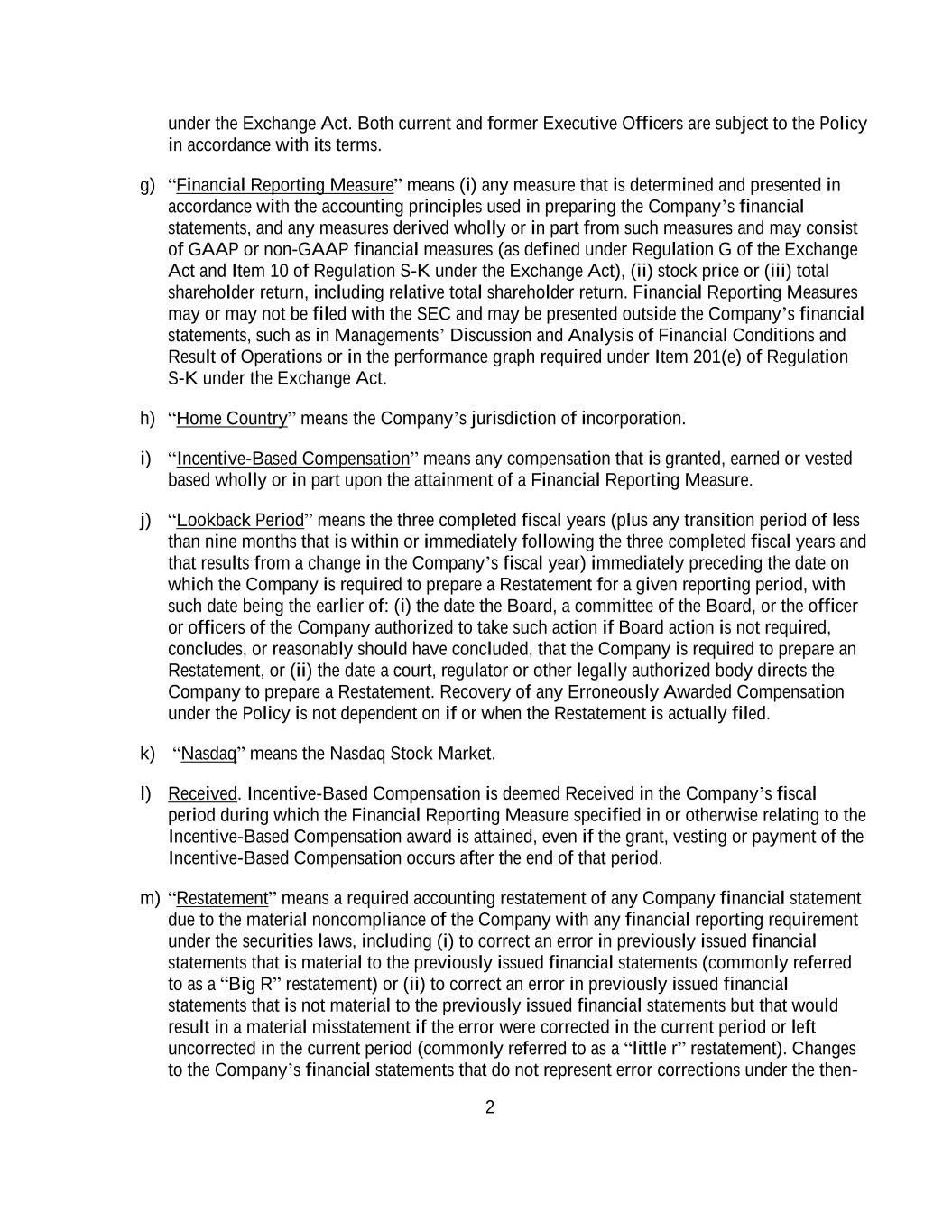 2 under the Exchange Act. Both current and former Executive Officers are subject to the Policy in accordance with its terms. g) “Financial Reporting Measure” means (i) any measure that is determined and presented in accordance with the accounting principles used in preparing the Company’s financial statements, and any measures derived wholly or in part from such measures and may consist of GAAP or non-GAAP financial measures (as defined under Regulation G of the Exchange Act and Item 10 of Regulation S-K under the Exchange Act), (ii) stock price or (iii) total shareholder return, including relative total shareholder return. Financial Reporting Measures may or may not be filed with the SEC and may be presented outside the Company’s financial statements, such as in Managements’ Discussion and Analysis of Financial Conditions and Result of Operations or in the performance graph required under Item 201(e) of Regulation S-K under the Exchange Act. h) “Home Country” means the Company’s jurisdiction of incorporation. i) “Incentive-Based Compensation” means any compensation that is granted, earned or vested based wholly or in part upon the attainment of a Financial Reporting Measure. j) “Lookback Period” means the three completed fiscal years (plus any transition period of less than nine months that is within or immediately following the three completed fiscal years and that results from a change in the Company’s fiscal year) immediately preceding the date on which the Company is required to prepare a Restatement for a given reporting period, with such date being the earlier of: (i) the date the Board, a committee of the Board, or the officer or officers of the Company authorized to take such action if Board action is not required, concludes, or reasonably should have concluded, that the Company is required to prepare an Restatement, or (ii) the date a court, regulator or other legally authorized body directs the Company to prepare a Restatement. Recovery of any Erroneously Awarded Compensation under the Policy is not dependent on if or when the Restatement is actually filed. k) “Nasdaq” means the Nasdaq Stock Market. l) Received. Incentive-Based Compensation is deemed Received in the Company’s fiscal period during which the Financial Reporting Measure specified in or otherwise relating to the Incentive-Based Compensation award is attained, even if the grant, vesting or payment of the Incentive-Based Compensation occurs after the end of that period. m) “Restatement” means a required accounting restatement of any Company financial statement due to the material noncompliance of the Company with any financial reporting requirement under the securities laws, including (i) to correct an error in previously issued financial statements that is material to the previously issued financial statements (commonly referred to as a “Big R” restatement) or (ii) to correct an error in previously issued financial statements that is not material to the previously issued financial statements but that would result in a material misstatement if the error were corrected in the current period or left uncorrected in the current period (commonly referred to as a “little r” restatement). Changes to the Company’s financial statements that do not represent error corrections under the then-