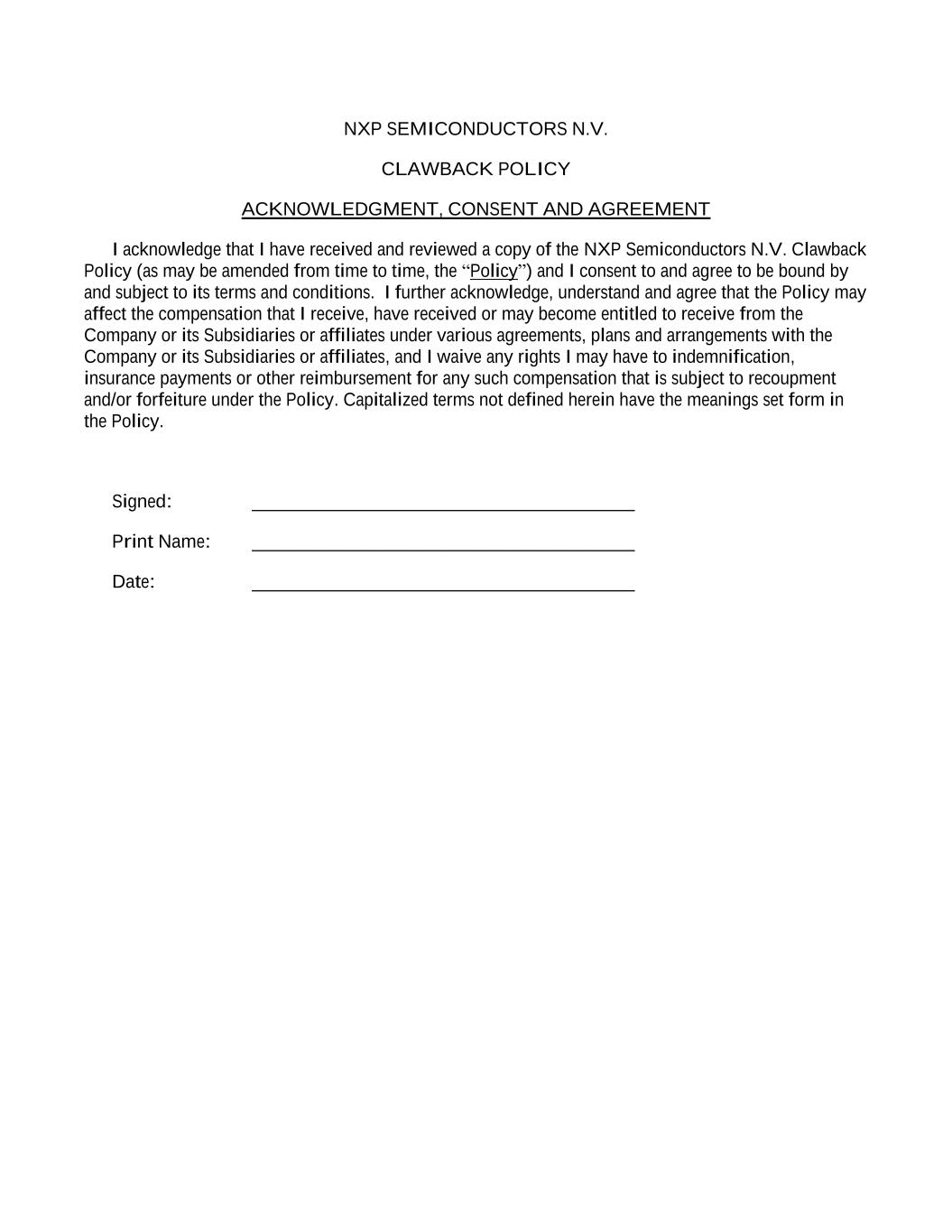 NXP SEMICONDUCTORS N.V. CLAWBACK POLICY ACKNOWLEDGMENT, CONSENT AND AGREEMENT I acknowledge that I have received and reviewed a copy of the NXP Semiconductors N.V. Clawback Policy (as may be amended from time to time, the “Policy”) and I consent to and agree to be bound by and subject to its terms and conditions. I further acknowledge, understand and agree that the Policy may affect the compensation that I receive, have received or may become entitled to receive from the Company or its Subsidiaries or affiliates under various agreements, plans and arrangements with the Company or its Subsidiaries or affiliates, and I waive any rights I may have to indemnification, insurance payments or other reimbursement for any such compensation that is subject to recoupment and/or forfeiture under the Policy. Capitalized terms not defined herein have the meanings set form in the Policy. Signed: _________________________________________ Print Name: _________________________________________ Date: _________________________________________