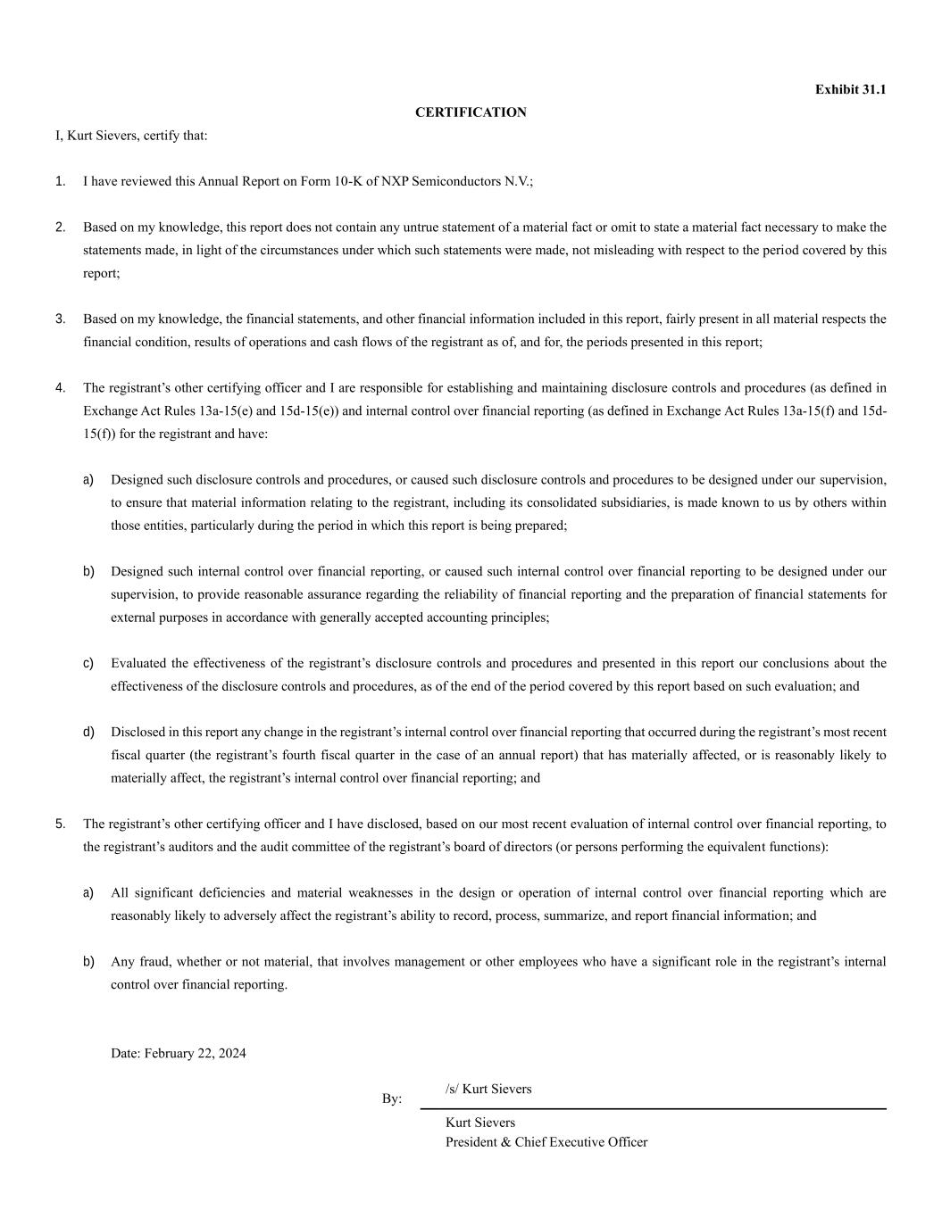 Exhibit 31.1 CERTIFICATION I, Kurt Sievers, certify that: 1. I have reviewed this Annual Report on Form 10-K of NXP Semiconductors N.V.; 2. Based on my knowledge, this report does not contain any untrue statement of a material fact or omit to state a material fact necessary to make the statements made, in light of the circumstances under which such statements were made, not misleading with respect to the period covered by this report; 3. Based on my knowledge, the financial statements, and other financial information included in this report, fairly present in all material respects the financial condition, results of operations and cash flows of the registrant as of, and for, the periods presented in this report; 4. The registrant’s other certifying officer and I are responsible for establishing and maintaining disclosure controls and procedures (as defined in Exchange Act Rules 13a-15(e) and 15d-15(e)) and internal control over financial reporting (as defined in Exchange Act Rules 13a-15(f) and 15d- 15(f)) for the registrant and have: a) Designed such disclosure controls and procedures, or caused such disclosure controls and procedures to be designed under our supervision, to ensure that material information relating to the registrant, including its consolidated subsidiaries, is made known to us by others within those entities, particularly during the period in which this report is being prepared; b) Designed such internal control over financial reporting, or caused such internal control over financial reporting to be designed under our supervision, to provide reasonable assurance regarding the reliability of financial reporting and the preparation of financial statements for external purposes in accordance with generally accepted accounting principles; c) Evaluated the effectiveness of the registrant’s disclosure controls and procedures and presented in this report our conclusions about the effectiveness of the disclosure controls and procedures, as of the end of the period covered by this report based on such evaluation; and d) Disclosed in this report any change in the registrant’s internal control over financial reporting that occurred during the registrant’s most recent fiscal quarter (the registrant’s fourth fiscal quarter in the case of an annual report) that has materially affected, or is reasonably likely to materially affect, the registrant’s internal control over financial reporting; and 5. The registrant’s other certifying officer and I have disclosed, based on our most recent evaluation of internal control over financial reporting, to the registrant’s auditors and the audit committee of the registrant’s board of directors (or persons performing the equivalent functions): a) All significant deficiencies and material weaknesses in the design or operation of internal control over financial reporting which are reasonably likely to adversely affect the registrant’s ability to record, process, summarize, and report financial information; and b) Any fraud, whether or not material, that involves management or other employees who have a significant role in the registrant’s internal control over financial reporting. Date: February 22, 2024 By: /s/ Kurt Sievers Kurt Sievers President & Chief Executive Officer