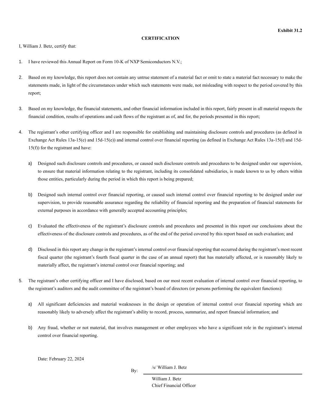 Exhibit 31.2 CERTIFICATION I, William J. Betz, certify that: 1. I have reviewed this Annual Report on Form 10-K of NXP Semiconductors N.V.; 2. Based on my knowledge, this report does not contain any untrue statement of a material fact or omit to state a material fact necessary to make the statements made, in light of the circumstances under which such statements were made, not misleading with respect to the period covered by this report; 3. Based on my knowledge, the financial statements, and other financial information included in this report, fairly present in all material respects the financial condition, results of operations and cash flows of the registrant as of, and for, the periods presented in this report; 4. The registrant’s other certifying officer and I are responsible for establishing and maintaining disclosure controls and procedures (as defined in Exchange Act Rules 13a-15(e) and 15d-15(e)) and internal control over financial reporting (as defined in Exchange Act Rules 13a-15(f) and 15d- 15(f)) for the registrant and have: a) Designed such disclosure controls and procedures, or caused such disclosure controls and procedures to be designed under our supervision, to ensure that material information relating to the registrant, including its consolidated subsidiaries, is made known to us by others within those entities, particularly during the period in which this report is being prepared; b) Designed such internal control over financial reporting, or caused such internal control over financial reporting to be designed under our supervision, to provide reasonable assurance regarding the reliability of financial reporting and the preparation of financial statements for external purposes in accordance with generally accepted accounting principles; c) Evaluated the effectiveness of the registrant’s disclosure controls and procedures and presented in this report our conclusions about the effectiveness of the disclosure controls and procedures, as of the end of the period covered by this report based on such evaluation; and d) Disclosed in this report any change in the registrant’s internal control over financial reporting that occurred during the registrant’s most recent fiscal quarter (the registrant’s fourth fiscal quarter in the case of an annual report) that has materially affected, or is reasonably likely to materially affect, the registrant’s internal control over financial reporting; and 5. The registrant’s other certifying officer and I have disclosed, based on our most recent evaluation of internal control over financial reporting, to the registrant’s auditors and the audit committee of the registrant’s board of directors (or persons performing the equivalent functions): a) All significant deficiencies and material weaknesses in the design or operation of internal control over financial reporting which are reasonably likely to adversely affect the registrant’s ability to record, process, summarize, and report financial information; and b) Any fraud, whether or not material, that involves management or other employees who have a significant role in the registrant’s internal control over financial reporting. Date: February 22, 2024 By: /s/ William J. Betz William J. Betz Chief Financial Officer