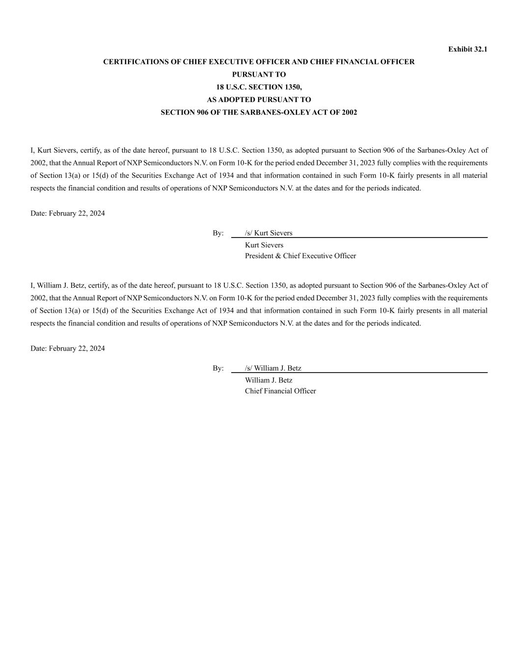 Exhibit 32.1 CERTIFICATIONS OF CHIEF EXECUTIVE OFFICER AND CHIEF FINANCIAL OFFICER PURSUANT TO 18 U.S.C. SECTION 1350, AS ADOPTED PURSUANT TO SECTION 906 OF THE SARBANES-OXLEY ACT OF 2002 I, Kurt Sievers, certify, as of the date hereof, pursuant to 18 U.S.C. Section 1350, as adopted pursuant to Section 906 of the Sarbanes-Oxley Act of 2002, that the Annual Report of NXP Semiconductors N.V. on Form 10-K for the period ended December 31, 2023 fully complies with the requirements of Section 13(a) or 15(d) of the Securities Exchange Act of 1934 and that information contained in such Form 10-K fairly presents in all material respects the financial condition and results of operations of NXP Semiconductors N.V. at the dates and for the periods indicated. Date: February 22, 2024 I, William J. Betz, certify, as of the date hereof, pursuant to 18 U.S.C. Section 1350, as adopted pursuant to Section 906 of the Sarbanes-Oxley Act of 2002, that the Annual Report of NXP Semiconductors N.V. on Form 10-K for the period ended December 31, 2023 fully complies with the requirements of Section 13(a) or 15(d) of the Securities Exchange Act of 1934 and that information contained in such Form 10-K fairly presents in all material respects the financial condition and results of operations of NXP Semiconductors N.V. at the dates and for the periods indicated. Date: February 22, 2024 By: /s/ Kurt Sievers Kurt Sievers President & Chief Executive Officer By: /s/ William J. Betz William J. Betz Chief Financial Officer