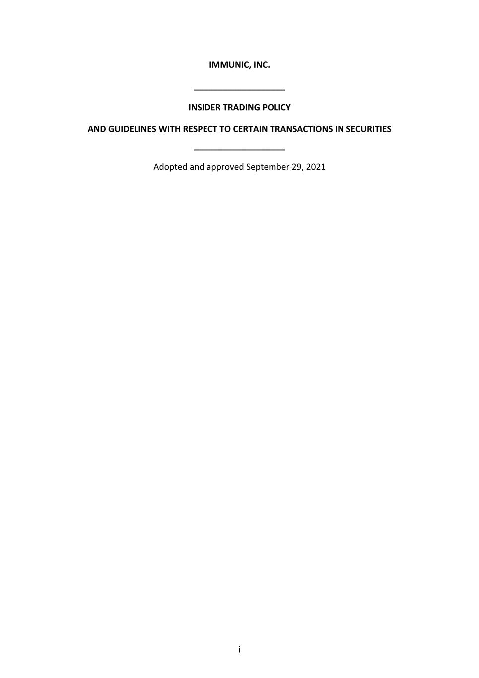 i IMMUNIC, INC. ___________________ INSIDER TRADING POLICY AND GUIDELINES WITH RESPECT TO CERTAIN TRANSACTIONS IN SECURITIES ___________________ Adopted and approved September 29, 2021