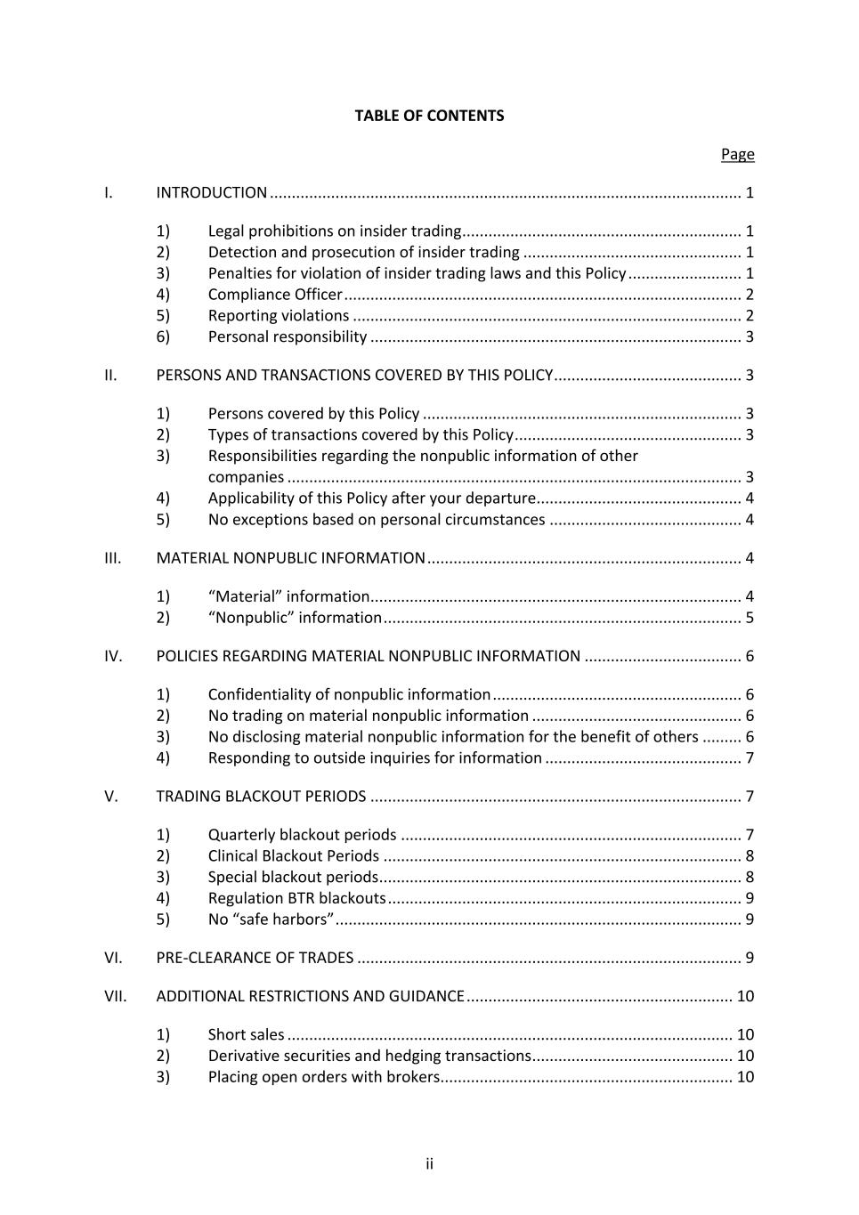 ii TABLE OF CONTENTS Page I. INTRODUCTION ............................................................................................................ 1 1) Legal prohibitions on insider trading ................................................................ 1 2) Detection and prosecution of insider trading .................................................. 1 3) Penalties for violation of insider trading laws and this Policy .......................... 1 4) Compliance Officer ........................................................................................... 2 5) Reporting violations ......................................................................................... 2 6) Personal responsibility ..................................................................................... 3 II. PERSONS AND TRANSACTIONS COVERED BY THIS POLICY ........................................... 3 1) Persons covered by this Policy ......................................................................... 3 2) Types of transactions covered by this Policy .................................................... 3 3) Responsibilities regarding the nonpublic information of other companies ........................................................................................................ 3 4) Applicability of this Policy after your departure ............................................... 4 5) No exceptions based on personal circumstances ............................................ 4 III. MATERIAL NONPUBLIC INFORMATION ........................................................................ 4 1) “Material” information ..................................................................................... 4 2) “Nonpublic” information .................................................................................. 5 IV. POLICIES REGARDING MATERIAL NONPUBLIC INFORMATION .................................... 6 1) Confidentiality of nonpublic information ......................................................... 6 2) No trading on material nonpublic information ................................................ 6 3) No disclosing material nonpublic information for the benefit of others ......... 6 4) Responding to outside inquiries for information ............................................. 7 V. TRADING BLACKOUT PERIODS ..................................................................................... 7 1) Quarterly blackout periods .............................................................................. 7 2) Clinical Blackout Periods .................................................................................. 8 3) Special blackout periods ................................................................................... 8 4) Regulation BTR blackouts ................................................................................. 9 5) No “safe harbors” ............................................................................................. 9 VI. PRE-CLEARANCE OF TRADES ........................................................................................ 9 VII. ADDITIONAL RESTRICTIONS AND GUIDANCE ............................................................. 10 1) Short sales ...................................................................................................... 10 2) Derivative securities and hedging transactions .............................................. 10 3) Placing open orders with brokers ................................................................... 10