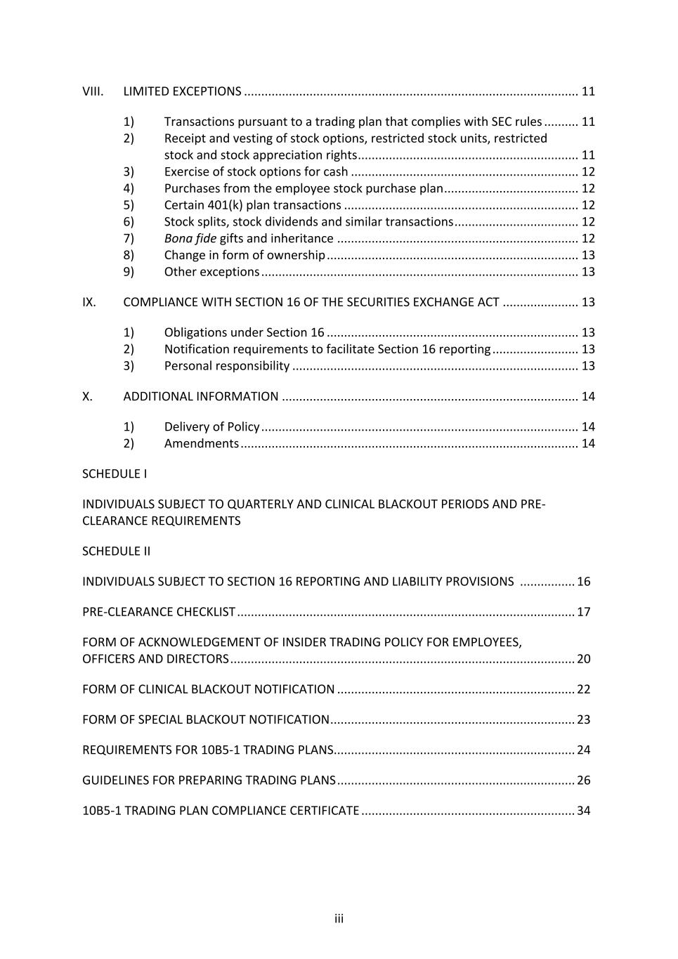 iii VIII. LIMITED EXCEPTIONS ................................................................................................. 11 1) Transactions pursuant to a trading plan that complies with SEC rules .......... 11 2) Receipt and vesting of stock options, restricted stock units, restricted stock and stock appreciation rights ................................................................ 11 3) Exercise of stock options for cash .................................................................. 12 4) Purchases from the employee stock purchase plan ....................................... 12 5) Certain 401(k) plan transactions .................................................................... 12 6) Stock splits, stock dividends and similar transactions .................................... 12 7) Bona fide gifts and inheritance ...................................................................... 12 8) Change in form of ownership ......................................................................... 13 9) Other exceptions ............................................................................................ 13 IX. COMPLIANCE WITH SECTION 16 OF THE SECURITIES EXCHANGE ACT ...................... 13 1) Obligations under Section 16 ......................................................................... 13 2) Notification requirements to facilitate Section 16 reporting ......................... 13 3) Personal responsibility ................................................................................... 13 X. ADDITIONAL INFORMATION ...................................................................................... 14 1) Delivery of Policy ............................................................................................ 14 2) Amendments .................................................................................................. 14 SCHEDULE I INDIVIDUALS SUBJECT TO QUARTERLY AND CLINICAL BLACKOUT PERIODS AND PRE- CLEARANCE REQUIREMENTS SCHEDULE II INDIVIDUALS SUBJECT TO SECTION 16 REPORTING AND LIABILITY PROVISIONS ................ 16 PRE-CLEARANCE CHECKLIST .................................................................................................. 17 FORM OF ACKNOWLEDGEMENT OF INSIDER TRADING POLICY FOR EMPLOYEES, OFFICERS AND DIRECTORS .................................................................................................... 20 FORM OF CLINICAL BLACKOUT NOTIFICATION ..................................................................... 22 FORM OF SPECIAL BLACKOUT NOTIFICATION ....................................................................... 23 REQUIREMENTS FOR 10B5-1 TRADING PLANS ...................................................................... 24 GUIDELINES FOR PREPARING TRADING PLANS ..................................................................... 26 10B5-1 TRADING PLAN COMPLIANCE CERTIFICATE .............................................................. 34