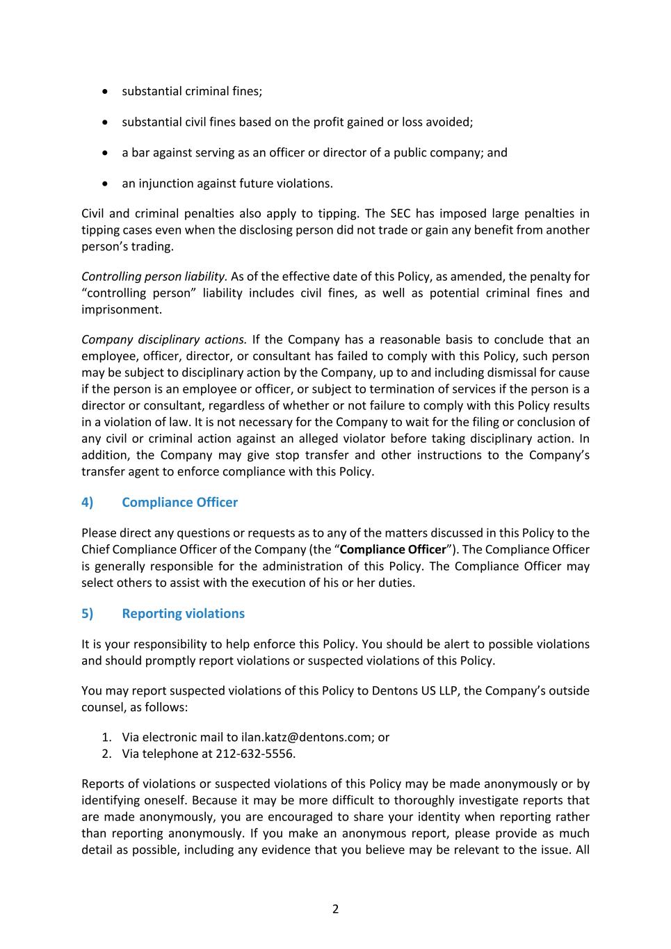 2 • substantial criminal fines; • substantial civil fines based on the profit gained or loss avoided; • a bar against serving as an officer or director of a public company; and • an injunction against future violations. Civil and criminal penalties also apply to tipping. The SEC has imposed large penalties in tipping cases even when the disclosing person did not trade or gain any benefit from another person’s trading. Controlling person liability. As of the effective date of this Policy, as amended, the penalty for “controlling person” liability includes civil fines, as well as potential criminal fines and imprisonment. Company disciplinary actions. If the Company has a reasonable basis to conclude that an employee, officer, director, or consultant has failed to comply with this Policy, such person may be subject to disciplinary action by the Company, up to and including dismissal for cause if the person is an employee or officer, or subject to termination of services if the person is a director or consultant, regardless of whether or not failure to comply with this Policy results in a violation of law. It is not necessary for the Company to wait for the filing or conclusion of any civil or criminal action against an alleged violator before taking disciplinary action. In addition, the Company may give stop transfer and other instructions to the Company’s transfer agent to enforce compliance with this Policy. 4) Compliance Officer Please direct any questions or requests as to any of the matters discussed in this Policy to the Chief Compliance Officer of the Company (the “Compliance Officer”). The Compliance Officer is generally responsible for the administration of this Policy. The Compliance Officer may select others to assist with the execution of his or her duties. 5) Reporting violations It is your responsibility to help enforce this Policy. You should be alert to possible violations and should promptly report violations or suspected violations of this Policy. You may report suspected violations of this Policy to Dentons US LLP, the Company’s outside counsel, as follows: 1. Via electronic mail to ilan.katz@dentons.com; or 2. Via telephone at 212-632-5556. Reports of violations or suspected violations of this Policy may be made anonymously or by identifying oneself. Because it may be more difficult to thoroughly investigate reports that are made anonymously, you are encouraged to share your identity when reporting rather than reporting anonymously. If you make an anonymous report, please provide as much detail as possible, including any evidence that you believe may be relevant to the issue. All