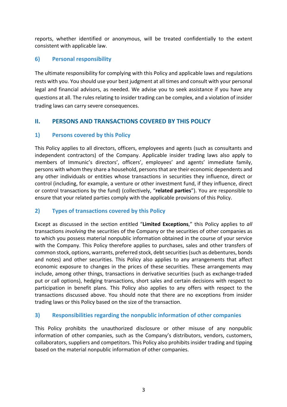 3 reports, whether identified or anonymous, will be treated confidentially to the extent consistent with applicable law. 6) Personal responsibility The ultimate responsibility for complying with this Policy and applicable laws and regulations rests with you. You should use your best judgment at all times and consult with your personal legal and financial advisors, as needed. We advise you to seek assistance if you have any questions at all. The rules relating to insider trading can be complex, and a violation of insider trading laws can carry severe consequences. II. PERSONS AND TRANSACTIONS COVERED BY THIS POLICY 1) Persons covered by this Policy This Policy applies to all directors, officers, employees and agents (such as consultants and independent contractors) of the Company. Applicable insider trading laws also apply to members of Immunic’s directors’, officers’, employees’ and agents’ immediate family, persons with whom they share a household, persons that are their economic dependents and any other individuals or entities whose transactions in securities they influence, direct or control (including, for example, a venture or other investment fund, if they influence, direct or control transactions by the fund) (collectively, “related parties”). You are responsible to ensure that your related parties comply with the applicable provisions of this Policy. 2) Types of transactions covered by this Policy Except as discussed in the section entitled “Limited Exceptions,” this Policy applies to all transactions involving the securities of the Company or the securities of other companies as to which you possess material nonpublic information obtained in the course of your service with the Company. This Policy therefore applies to purchases, sales and other transfers of common stock, options, warrants, preferred stock, debt securities (such as debentures, bonds and notes) and other securities. This Policy also applies to any arrangements that affect economic exposure to changes in the prices of these securities. These arrangements may include, among other things, transactions in derivative securities (such as exchange-traded put or call options), hedging transactions, short sales and certain decisions with respect to participation in benefit plans. This Policy also applies to any offers with respect to the transactions discussed above. You should note that there are no exceptions from insider trading laws or this Policy based on the size of the transaction. 3) Responsibilities regarding the nonpublic information of other companies This Policy prohibits the unauthorized disclosure or other misuse of any nonpublic information of other companies, such as the Company’s distributors, vendors, customers, collaborators, suppliers and competitors. This Policy also prohibits insider trading and tipping based on the material nonpublic information of other companies.