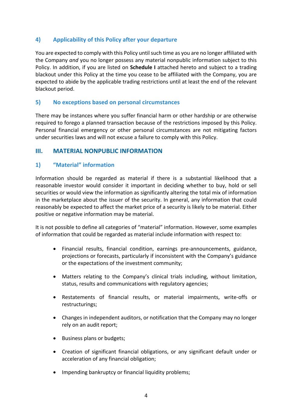 4 4) Applicability of this Policy after your departure You are expected to comply with this Policy until such time as you are no longer affiliated with the Company and you no longer possess any material nonpublic information subject to this Policy. In addition, if you are listed on Schedule I attached hereto and subject to a trading blackout under this Policy at the time you cease to be affiliated with the Company, you are expected to abide by the applicable trading restrictions until at least the end of the relevant blackout period. 5) No exceptions based on personal circumstances There may be instances where you suffer financial harm or other hardship or are otherwise required to forego a planned transaction because of the restrictions imposed by this Policy. Personal financial emergency or other personal circumstances are not mitigating factors under securities laws and will not excuse a failure to comply with this Policy. III. MATERIAL NONPUBLIC INFORMATION 1) “Material” information Information should be regarded as material if there is a substantial likelihood that a reasonable investor would consider it important in deciding whether to buy, hold or sell securities or would view the information as significantly altering the total mix of information in the marketplace about the issuer of the security. In general, any information that could reasonably be expected to affect the market price of a security is likely to be material. Either positive or negative information may be material. It is not possible to define all categories of “material” information. However, some examples of information that could be regarded as material include information with respect to: • Financial results, financial condition, earnings pre-announcements, guidance, projections or forecasts, particularly if inconsistent with the Company’s guidance or the expectations of the investment community; • Matters relating to the Company’s clinical trials including, without limitation, status, results and communications with regulatory agencies; • Restatements of financial results, or material impairments, write-offs or restructurings; • Changes in independent auditors, or notification that the Company may no longer rely on an audit report; • Business plans or budgets; • Creation of significant financial obligations, or any significant default under or acceleration of any financial obligation; • Impending bankruptcy or financial liquidity problems;