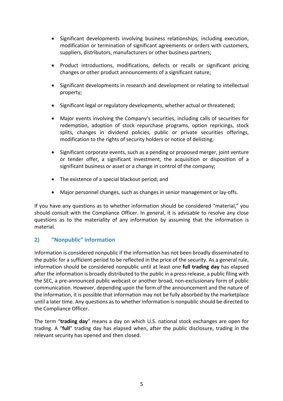 5 • Significant developments involving business relationships, including execution, modification or termination of significant agreements or orders with customers, suppliers, distributors, manufacturers or other business partners; • Product introductions, modifications, defects or recalls or significant pricing changes or other product announcements of a significant nature; • Significant developments in research and development or relating to intellectual property; • Significant legal or regulatory developments, whether actual or threatened; • Major events involving the Company’s securities, including calls of securities for redemption, adoption of stock repurchase programs, option repricings, stock splits, changes in dividend policies, public or private securities offerings, modification to the rights of security holders or notice of delisting; • Significant corporate events, such as a pending or proposed merger, joint venture or tender offer, a significant investment, the acquisition or disposition of a significant business or asset or a change in control of the company; • The existence of a special blackout period; and • Major personnel changes, such as changes in senior management or lay-offs. If you have any questions as to whether information should be considered “material,” you should consult with the Compliance Officer. In general, it is advisable to resolve any close questions as to the materiality of any information by assuming that the information is material. 2) “Nonpublic” information Information is considered nonpublic if the information has not been broadly disseminated to the public for a sufficient period to be reflected in the price of the security. As a general rule, information should be considered nonpublic until at least one full trading day has elapsed after the information is broadly distributed to the public in a press release, a public filing with the SEC, a pre-announced public webcast or another broad, non-exclusionary form of public communication. However, depending upon the form of the announcement and the nature of the information, it is possible that information may not be fully absorbed by the marketplace until a later time. Any questions as to whether information is nonpublic should be directed to the Compliance Officer. The term “trading day” means a day on which U.S. national stock exchanges are open for trading. A “full” trading day has elapsed when, after the public disclosure, trading in the relevant security has opened and then closed.