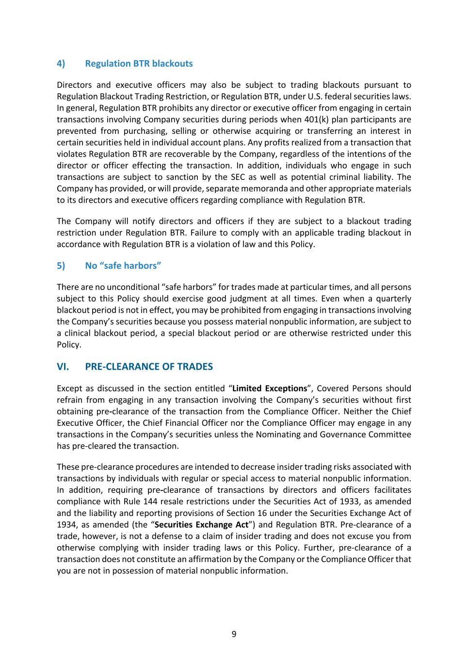 9 4) Regulation BTR blackouts Directors and executive officers may also be subject to trading blackouts pursuant to Regulation Blackout Trading Restriction, or Regulation BTR, under U.S. federal securities laws. In general, Regulation BTR prohibits any director or executive officer from engaging in certain transactions involving Company securities during periods when 401(k) plan participants are prevented from purchasing, selling or otherwise acquiring or transferring an interest in certain securities held in individual account plans. Any profits realized from a transaction that violates Regulation BTR are recoverable by the Company, regardless of the intentions of the director or officer effecting the transaction. In addition, individuals who engage in such transactions are subject to sanction by the SEC as well as potential criminal liability. The Company has provided, or will provide, separate memoranda and other appropriate materials to its directors and executive officers regarding compliance with Regulation BTR. The Company will notify directors and officers if they are subject to a blackout trading restriction under Regulation BTR. Failure to comply with an applicable trading blackout in accordance with Regulation BTR is a violation of law and this Policy. 5) No “safe harbors” There are no unconditional “safe harbors” for trades made at particular times, and all persons subject to this Policy should exercise good judgment at all times. Even when a quarterly blackout period is not in effect, you may be prohibited from engaging in transactions involving the Company’s securities because you possess material nonpublic information, are subject to a clinical blackout period, a special blackout period or are otherwise restricted under this Policy. VI. PRE-CLEARANCE OF TRADES Except as discussed in the section entitled “Limited Exceptions”, Covered Persons should refrain from engaging in any transaction involving the Company’s securities without first obtaining pre-clearance of the transaction from the Compliance Officer. Neither the Chief Executive Officer, the Chief Financial Officer nor the Compliance Officer may engage in any transactions in the Company’s securities unless the Nominating and Governance Committee has pre-cleared the transaction. These pre-clearance procedures are intended to decrease insider trading risks associated with transactions by individuals with regular or special access to material nonpublic information. In addition, requiring pre-clearance of transactions by directors and officers facilitates compliance with Rule 144 resale restrictions under the Securities Act of 1933, as amended and the liability and reporting provisions of Section 16 under the Securities Exchange Act of 1934, as amended (the “Securities Exchange Act”) and Regulation BTR. Pre-clearance of a trade, however, is not a defense to a claim of insider trading and does not excuse you from otherwise complying with insider trading laws or this Policy. Further, pre-clearance of a transaction does not constitute an affirmation by the Company or the Compliance Officer that you are not in possession of material nonpublic information.