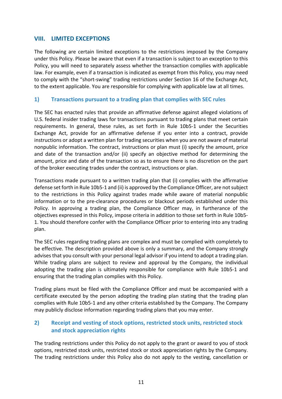 11 VIII. LIMITED EXCEPTIONS The following are certain limited exceptions to the restrictions imposed by the Company under this Policy. Please be aware that even if a transaction is subject to an exception to this Policy, you will need to separately assess whether the transaction complies with applicable law. For example, even if a transaction is indicated as exempt from this Policy, you may need to comply with the “short-swing” trading restrictions under Section 16 of the Exchange Act, to the extent applicable. You are responsible for complying with applicable law at all times. 1) Transactions pursuant to a trading plan that complies with SEC rules The SEC has enacted rules that provide an affirmative defense against alleged violations of U.S. federal insider trading laws for transactions pursuant to trading plans that meet certain requirements. In general, these rules, as set forth in Rule 10b5-1 under the Securities Exchange Act, provide for an affirmative defense if you enter into a contract, provide instructions or adopt a written plan for trading securities when you are not aware of material nonpublic information. The contract, instructions or plan must (i) specify the amount, price and date of the transaction and/or (ii) specify an objective method for determining the amount, price and date of the transaction so as to ensure there is no discretion on the part of the broker executing trades under the contract, instructions or plan. Transactions made pursuant to a written trading plan that (i) complies with the affirmative defense set forth in Rule 10b5-1 and (ii) is approved by the Compliance Officer, are not subject to the restrictions in this Policy against trades made while aware of material nonpublic information or to the pre-clearance procedures or blackout periods established under this Policy. In approving a trading plan, the Compliance Officer may, in furtherance of the objectives expressed in this Policy, impose criteria in addition to those set forth in Rule 10b5- 1. You should therefore confer with the Compliance Officer prior to entering into any trading plan. The SEC rules regarding trading plans are complex and must be complied with completely to be effective. The description provided above is only a summary, and the Company strongly advises that you consult with your personal legal advisor if you intend to adopt a trading plan. While trading plans are subject to review and approval by the Company, the individual adopting the trading plan is ultimately responsible for compliance with Rule 10b5-1 and ensuring that the trading plan complies with this Policy. Trading plans must be filed with the Compliance Officer and must be accompanied with a certificate executed by the person adopting the trading plan stating that the trading plan complies with Rule 10b5-1 and any other criteria established by the Company. The Company may publicly disclose information regarding trading plans that you may enter. 2) Receipt and vesting of stock options, restricted stock units, restricted stock and stock appreciation rights The trading restrictions under this Policy do not apply to the grant or award to you of stock options, restricted stock units, restricted stock or stock appreciation rights by the Company. The trading restrictions under this Policy also do not apply to the vesting, cancellation or