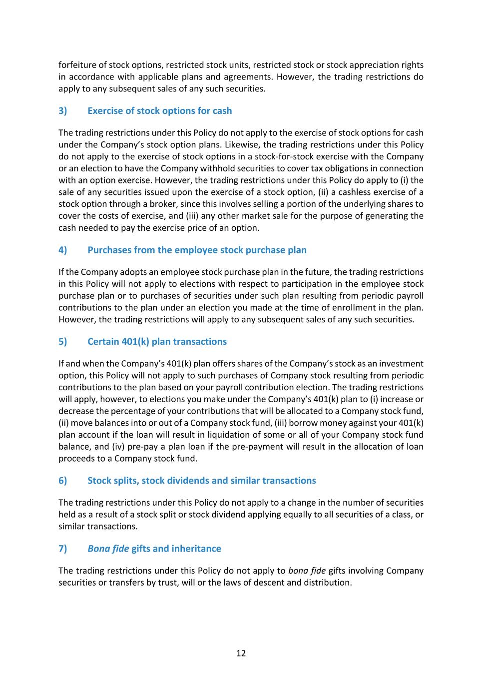 12 forfeiture of stock options, restricted stock units, restricted stock or stock appreciation rights in accordance with applicable plans and agreements. However, the trading restrictions do apply to any subsequent sales of any such securities. 3) Exercise of stock options for cash The trading restrictions under this Policy do not apply to the exercise of stock options for cash under the Company’s stock option plans. Likewise, the trading restrictions under this Policy do not apply to the exercise of stock options in a stock-for-stock exercise with the Company or an election to have the Company withhold securities to cover tax obligations in connection with an option exercise. However, the trading restrictions under this Policy do apply to (i) the sale of any securities issued upon the exercise of a stock option, (ii) a cashless exercise of a stock option through a broker, since this involves selling a portion of the underlying shares to cover the costs of exercise, and (iii) any other market sale for the purpose of generating the cash needed to pay the exercise price of an option. 4) Purchases from the employee stock purchase plan If the Company adopts an employee stock purchase plan in the future, the trading restrictions in this Policy will not apply to elections with respect to participation in the employee stock purchase plan or to purchases of securities under such plan resulting from periodic payroll contributions to the plan under an election you made at the time of enrollment in the plan. However, the trading restrictions will apply to any subsequent sales of any such securities. 5) Certain 401(k) plan transactions If and when the Company’s 401(k) plan offers shares of the Company’s stock as an investment option, this Policy will not apply to such purchases of Company stock resulting from periodic contributions to the plan based on your payroll contribution election. The trading restrictions will apply, however, to elections you make under the Company’s 401(k) plan to (i) increase or decrease the percentage of your contributions that will be allocated to a Company stock fund, (ii) move balances into or out of a Company stock fund, (iii) borrow money against your 401(k) plan account if the loan will result in liquidation of some or all of your Company stock fund balance, and (iv) pre-pay a plan loan if the pre-payment will result in the allocation of loan proceeds to a Company stock fund. 6) Stock splits, stock dividends and similar transactions The trading restrictions under this Policy do not apply to a change in the number of securities held as a result of a stock split or stock dividend applying equally to all securities of a class, or similar transactions. 7) Bona fide gifts and inheritance The trading restrictions under this Policy do not apply to bona fide gifts involving Company securities or transfers by trust, will or the laws of descent and distribution.