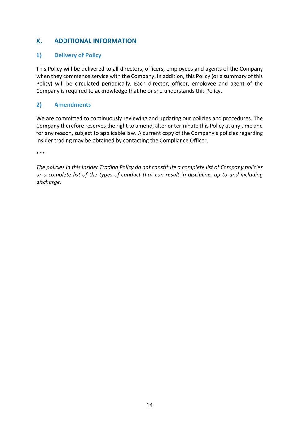 14 X. ADDITIONAL INFORMATION 1) Delivery of Policy This Policy will be delivered to all directors, officers, employees and agents of the Company when they commence service with the Company. In addition, this Policy (or a summary of this Policy) will be circulated periodically. Each director, officer, employee and agent of the Company is required to acknowledge that he or she understands this Policy. 2) Amendments We are committed to continuously reviewing and updating our policies and procedures. The Company therefore reserves the right to amend, alter or terminate this Policy at any time and for any reason, subject to applicable law. A current copy of the Company’s policies regarding insider trading may be obtained by contacting the Compliance Officer. *** The policies in this Insider Trading Policy do not constitute a complete list of Company policies or a complete list of the types of conduct that can result in discipline, up to and including discharge.