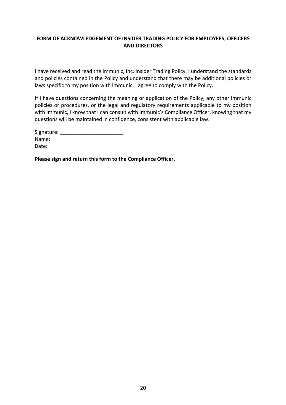20 FORM OF ACKNOWLEDGEMENT OF INSIDER TRADING POLICY FOR EMPLOYEES, OFFICERS AND DIRECTORS I have received and read the Immunic, Inc. Insider Trading Policy. I understand the standards and policies contained in the Policy and understand that there may be additional policies or laws specific to my position with Immunic. I agree to comply with the Policy. If I have questions concerning the meaning or application of the Policy, any other Immunic policies or procedures, or the legal and regulatory requirements applicable to my position with Immunic, I know that I can consult with Immunic’s Compliance Officer, knowing that my questions will be maintained in confidence, consistent with applicable law. Signature: ______________________ Name: Date: Please sign and return this form to the Compliance Officer.