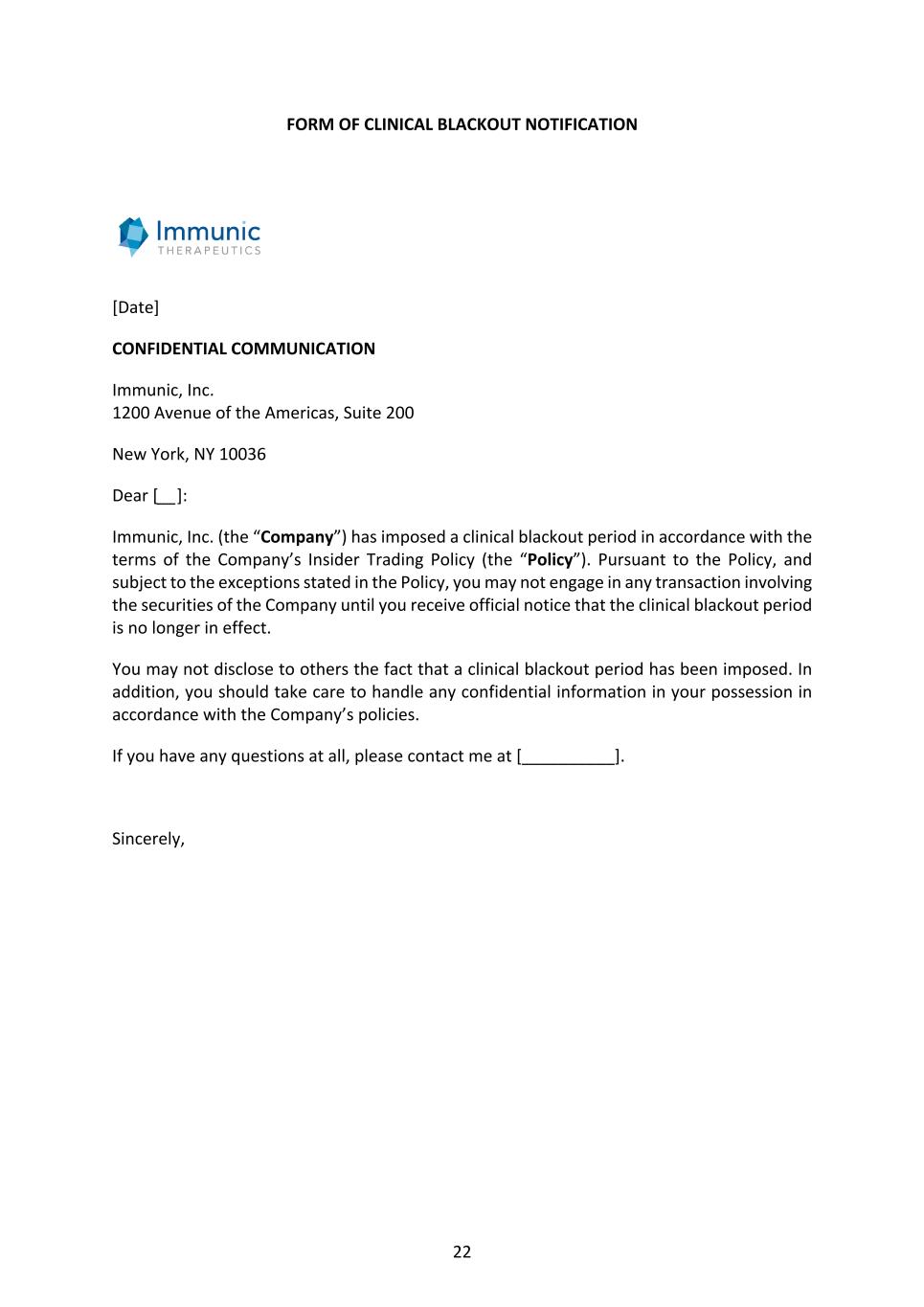 22 FORM OF CLINICAL BLACKOUT NOTIFICATION [Date] CONFIDENTIAL COMMUNICATION Immunic, Inc. 1200 Avenue of the Americas, Suite 200 New York, NY 10036 Dear [__]: Immunic, Inc. (the “Company”) has imposed a clinical blackout period in accordance with the terms of the Company’s Insider Trading Policy (the “Policy”). Pursuant to the Policy, and subject to the exceptions stated in the Policy, you may not engage in any transaction involving the securities of the Company until you receive official notice that the clinical blackout period is no longer in effect. You may not disclose to others the fact that a clinical blackout period has been imposed. In addition, you should take care to handle any confidential information in your possession in accordance with the Company’s policies. If you have any questions at all, please contact me at [__________]. Sincerely,
