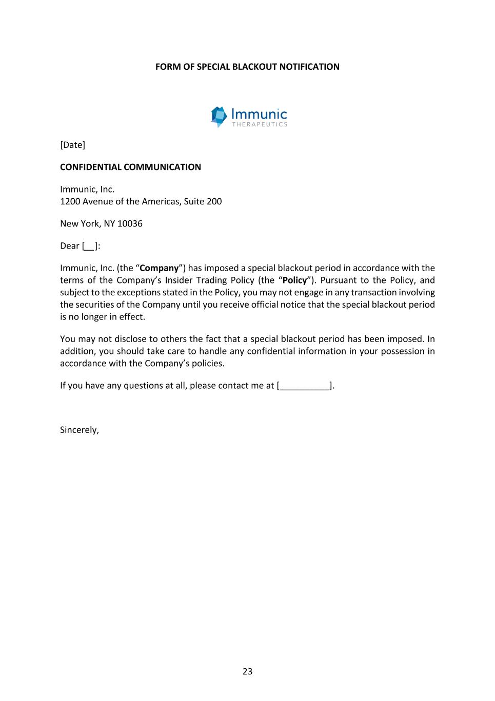23 FORM OF SPECIAL BLACKOUT NOTIFICATION [Date] CONFIDENTIAL COMMUNICATION Immunic, Inc. 1200 Avenue of the Americas, Suite 200 New York, NY 10036 Dear [__]: Immunic, Inc. (the “Company”) has imposed a special blackout period in accordance with the terms of the Company’s Insider Trading Policy (the “Policy”). Pursuant to the Policy, and subject to the exceptions stated in the Policy, you may not engage in any transaction involving the securities of the Company until you receive official notice that the special blackout period is no longer in effect. You may not disclose to others the fact that a special blackout period has been imposed. In addition, you should take care to handle any confidential information in your possession in accordance with the Company’s policies. If you have any questions at all, please contact me at [__________]. Sincerely,