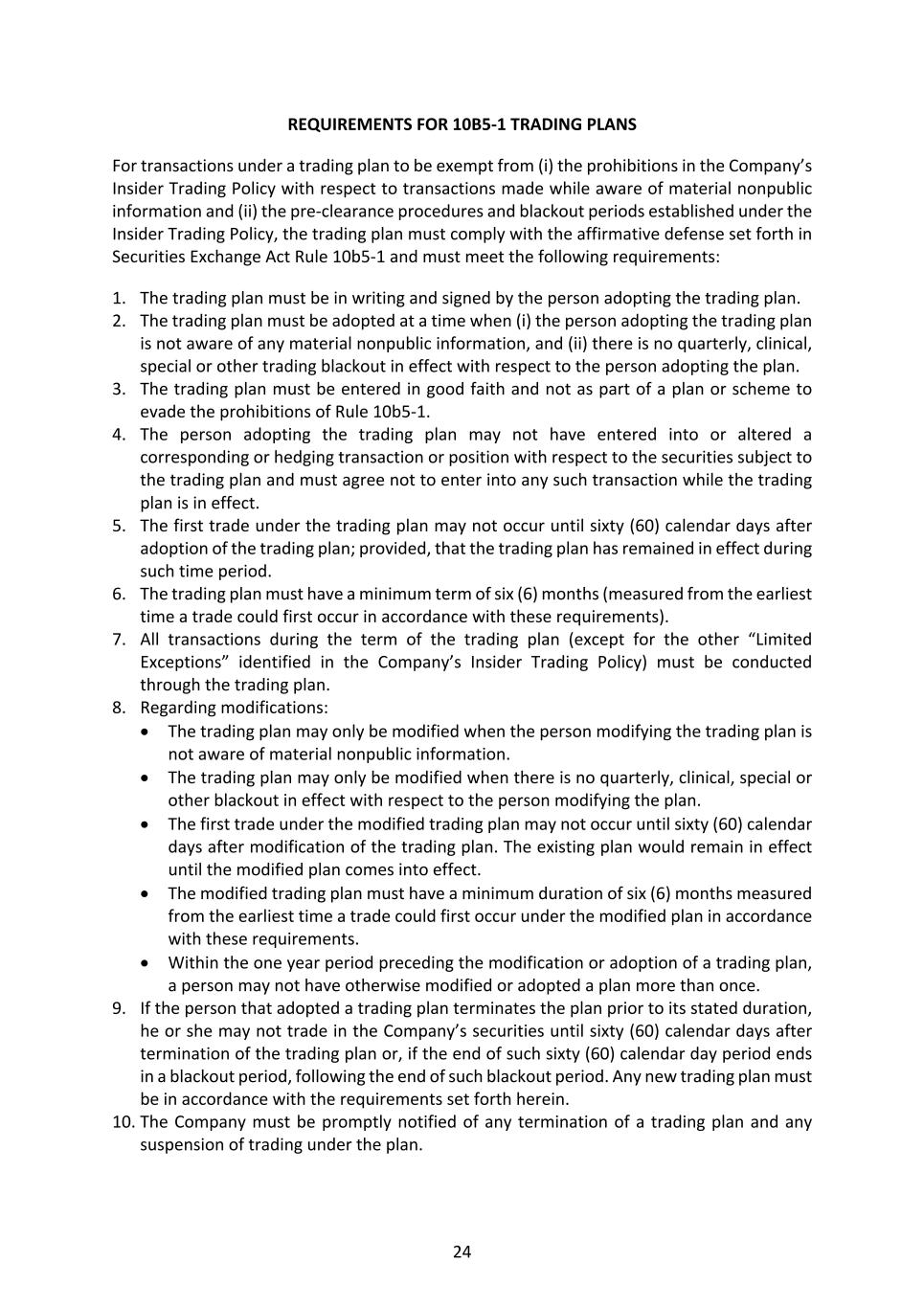 24 REQUIREMENTS FOR 10B5-1 TRADING PLANS For transactions under a trading plan to be exempt from (i) the prohibitions in the Company’s Insider Trading Policy with respect to transactions made while aware of material nonpublic information and (ii) the pre-clearance procedures and blackout periods established under the Insider Trading Policy, the trading plan must comply with the affirmative defense set forth in Securities Exchange Act Rule 10b5-1 and must meet the following requirements: 1. The trading plan must be in writing and signed by the person adopting the trading plan. 2. The trading plan must be adopted at a time when (i) the person adopting the trading plan is not aware of any material nonpublic information, and (ii) there is no quarterly, clinical, special or other trading blackout in effect with respect to the person adopting the plan. 3. The trading plan must be entered in good faith and not as part of a plan or scheme to evade the prohibitions of Rule 10b5-1. 4. The person adopting the trading plan may not have entered into or altered a corresponding or hedging transaction or position with respect to the securities subject to the trading plan and must agree not to enter into any such transaction while the trading plan is in effect. 5. The first trade under the trading plan may not occur until sixty (60) calendar days after adoption of the trading plan; provided, that the trading plan has remained in effect during such time period. 6. The trading plan must have a minimum term of six (6) months (measured from the earliest time a trade could first occur in accordance with these requirements). 7. All transactions during the term of the trading plan (except for the other “Limited Exceptions” identified in the Company’s Insider Trading Policy) must be conducted through the trading plan. 8. Regarding modifications: • The trading plan may only be modified when the person modifying the trading plan is not aware of material nonpublic information. • The trading plan may only be modified when there is no quarterly, clinical, special or other blackout in effect with respect to the person modifying the plan. • The first trade under the modified trading plan may not occur until sixty (60) calendar days after modification of the trading plan. The existing plan would remain in effect until the modified plan comes into effect. • The modified trading plan must have a minimum duration of six (6) months measured from the earliest time a trade could first occur under the modified plan in accordance with these requirements. • Within the one year period preceding the modification or adoption of a trading plan, a person may not have otherwise modified or adopted a plan more than once. 9. If the person that adopted a trading plan terminates the plan prior to its stated duration, he or she may not trade in the Company’s securities until sixty (60) calendar days after termination of the trading plan or, if the end of such sixty (60) calendar day period ends in a blackout period, following the end of such blackout period. Any new trading plan must be in accordance with the requirements set forth herein. 10. The Company must be promptly notified of any termination of a trading plan and any suspension of trading under the plan.