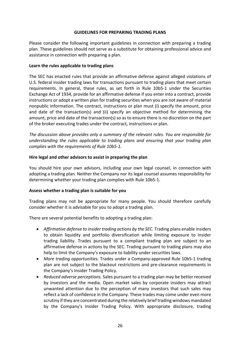 26 GUIDELINES FOR PREPARING TRADING PLANS Please consider the following important guidelines in connection with preparing a trading plan. These guidelines should not serve as a substitute for obtaining professional advice and assistance in connection with preparing a plan. Learn the rules applicable to trading plans The SEC has enacted rules that provide an affirmative defense against alleged violations of U.S. federal insider trading laws for transactions pursuant to trading plans that meet certain requirements. In general, these rules, as set forth in Rule 10b5-1 under the Securities Exchange Act of 1934, provide for an affirmative defense if you enter into a contract, provide instructions or adopt a written plan for trading securities when you are not aware of material nonpublic information. The contract, instructions or plan must (i) specify the amount, price and date of the transaction(s) and (ii) specify an objective method for determining the amount, price and date of the transaction(s) so as to ensure there is no discretion on the part of the broker executing trades under the contract, instructions or plan. The discussion above provides only a summary of the relevant rules. You are responsible for understanding the rules applicable to trading plans and ensuring that your trading plan complies with the requirements of Rule 10b5-1. Hire legal and other advisors to assist in preparing the plan You should hire your own advisors, including your own legal counsel, in connection with adopting a trading plan. Neither the Company nor its legal counsel assumes responsibility for determining whether your trading plan complies with Rule 10b5-1. Assess whether a trading plan is suitable for you Trading plans may not be appropriate for many people. You should therefore carefully consider whether it is advisable for you to adopt a trading plan. There are several potential benefits to adopting a trading plan: • Affirmative defense to insider trading actions by the SEC. Trading plans enable insiders to obtain liquidity and portfolio diversification while limiting exposure to insider trading liability. Trades pursuant to a compliant trading plan are subject to an affirmative defense in actions by the SEC. Trading pursuant to trading plans may also help to limit the Company’s exposure to liability under securities laws. • More trading opportunities. Trades under a Company-approved Rule 10b5-1 trading plan are not subject to the blackout restrictions and pre-clearance requirements in the Company’s Insider Trading Policy. • Reduced adverse perceptions. Sales pursuant to a trading plan may be better received by investors and the media. Open market sales by corporate insiders may attract unwanted attention due to the perception of many investors that such sales may reflect a lack of confidence in the Company. These trades may come under even more scrutiny if they are concentrated during the relatively brief trading windows mandated by the Company’s Insider Trading Policy. With appropriate disclosure, trading
