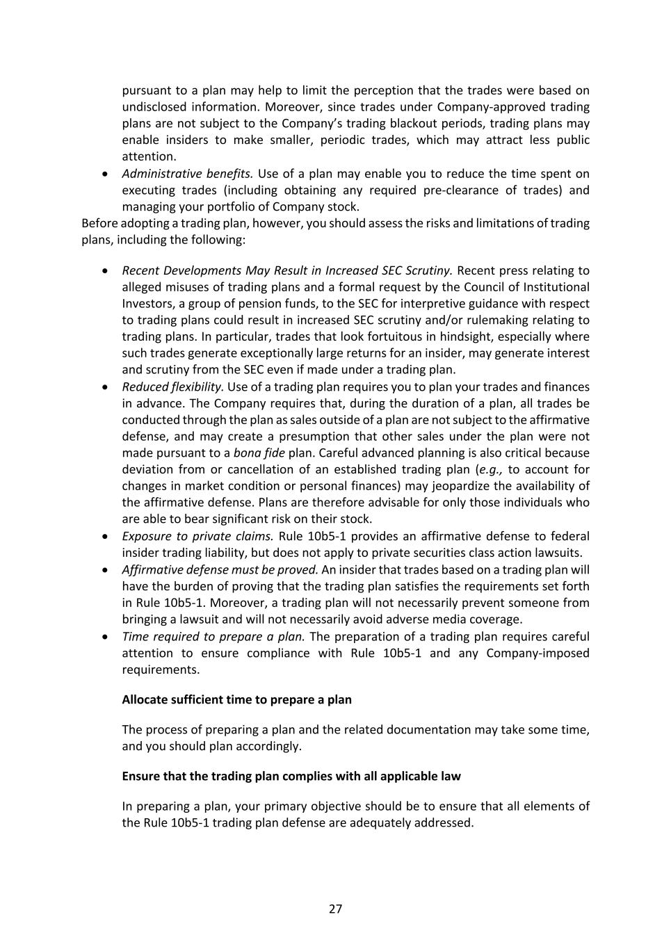27 pursuant to a plan may help to limit the perception that the trades were based on undisclosed information. Moreover, since trades under Company-approved trading plans are not subject to the Company’s trading blackout periods, trading plans may enable insiders to make smaller, periodic trades, which may attract less public attention. • Administrative benefits. Use of a plan may enable you to reduce the time spent on executing trades (including obtaining any required pre-clearance of trades) and managing your portfolio of Company stock. Before adopting a trading plan, however, you should assess the risks and limitations of trading plans, including the following: • Recent Developments May Result in Increased SEC Scrutiny. Recent press relating to alleged misuses of trading plans and a formal request by the Council of Institutional Investors, a group of pension funds, to the SEC for interpretive guidance with respect to trading plans could result in increased SEC scrutiny and/or rulemaking relating to trading plans. In particular, trades that look fortuitous in hindsight, especially where such trades generate exceptionally large returns for an insider, may generate interest and scrutiny from the SEC even if made under a trading plan. • Reduced flexibility. Use of a trading plan requires you to plan your trades and finances in advance. The Company requires that, during the duration of a plan, all trades be conducted through the plan as sales outside of a plan are not subject to the affirmative defense, and may create a presumption that other sales under the plan were not made pursuant to a bona fide plan. Careful advanced planning is also critical because deviation from or cancellation of an established trading plan (e.g., to account for changes in market condition or personal finances) may jeopardize the availability of the affirmative defense. Plans are therefore advisable for only those individuals who are able to bear significant risk on their stock. • Exposure to private claims. Rule 10b5-1 provides an affirmative defense to federal insider trading liability, but does not apply to private securities class action lawsuits. • Affirmative defense must be proved. An insider that trades based on a trading plan will have the burden of proving that the trading plan satisfies the requirements set forth in Rule 10b5-1. Moreover, a trading plan will not necessarily prevent someone from bringing a lawsuit and will not necessarily avoid adverse media coverage. • Time required to prepare a plan. The preparation of a trading plan requires careful attention to ensure compliance with Rule 10b5-1 and any Company-imposed requirements. Allocate sufficient time to prepare a plan The process of preparing a plan and the related documentation may take some time, and you should plan accordingly. Ensure that the trading plan complies with all applicable law In preparing a plan, your primary objective should be to ensure that all elements of the Rule 10b5-1 trading plan defense are adequately addressed.