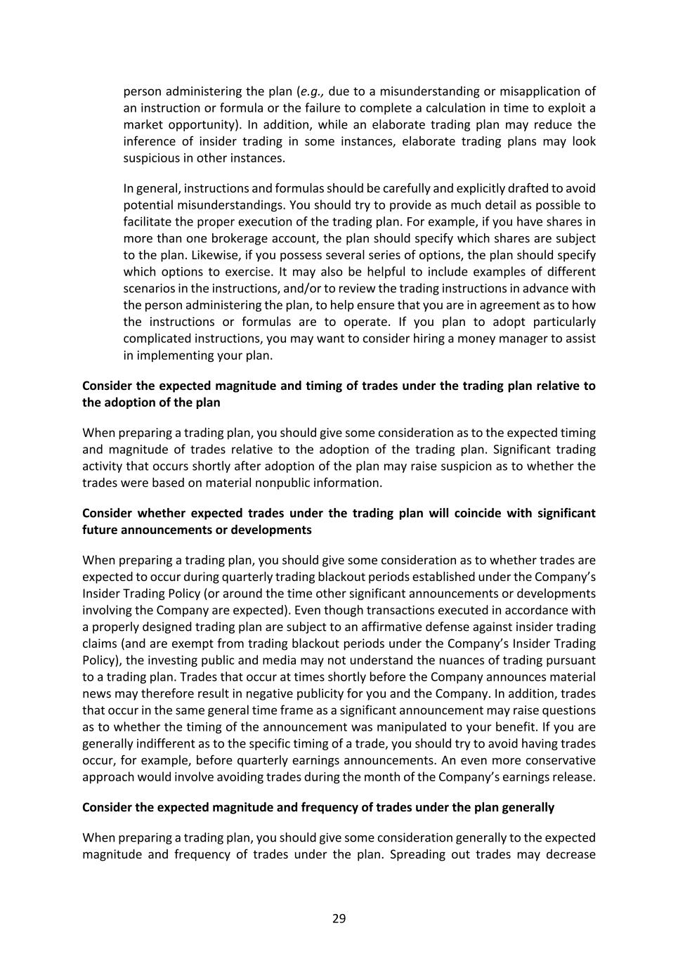 29 person administering the plan (e.g., due to a misunderstanding or misapplication of an instruction or formula or the failure to complete a calculation in time to exploit a market opportunity). In addition, while an elaborate trading plan may reduce the inference of insider trading in some instances, elaborate trading plans may look suspicious in other instances. In general, instructions and formulas should be carefully and explicitly drafted to avoid potential misunderstandings. You should try to provide as much detail as possible to facilitate the proper execution of the trading plan. For example, if you have shares in more than one brokerage account, the plan should specify which shares are subject to the plan. Likewise, if you possess several series of options, the plan should specify which options to exercise. It may also be helpful to include examples of different scenarios in the instructions, and/or to review the trading instructions in advance with the person administering the plan, to help ensure that you are in agreement as to how the instructions or formulas are to operate. If you plan to adopt particularly complicated instructions, you may want to consider hiring a money manager to assist in implementing your plan. Consider the expected magnitude and timing of trades under the trading plan relative to the adoption of the plan When preparing a trading plan, you should give some consideration as to the expected timing and magnitude of trades relative to the adoption of the trading plan. Significant trading activity that occurs shortly after adoption of the plan may raise suspicion as to whether the trades were based on material nonpublic information. Consider whether expected trades under the trading plan will coincide with significant future announcements or developments When preparing a trading plan, you should give some consideration as to whether trades are expected to occur during quarterly trading blackout periods established under the Company’s Insider Trading Policy (or around the time other significant announcements or developments involving the Company are expected). Even though transactions executed in accordance with a properly designed trading plan are subject to an affirmative defense against insider trading claims (and are exempt from trading blackout periods under the Company’s Insider Trading Policy), the investing public and media may not understand the nuances of trading pursuant to a trading plan. Trades that occur at times shortly before the Company announces material news may therefore result in negative publicity for you and the Company. In addition, trades that occur in the same general time frame as a significant announcement may raise questions as to whether the timing of the announcement was manipulated to your benefit. If you are generally indifferent as to the specific timing of a trade, you should try to avoid having trades occur, for example, before quarterly earnings announcements. An even more conservative approach would involve avoiding trades during the month of the Company’s earnings release. Consider the expected magnitude and frequency of trades under the plan generally When preparing a trading plan, you should give some consideration generally to the expected magnitude and frequency of trades under the plan. Spreading out trades may decrease