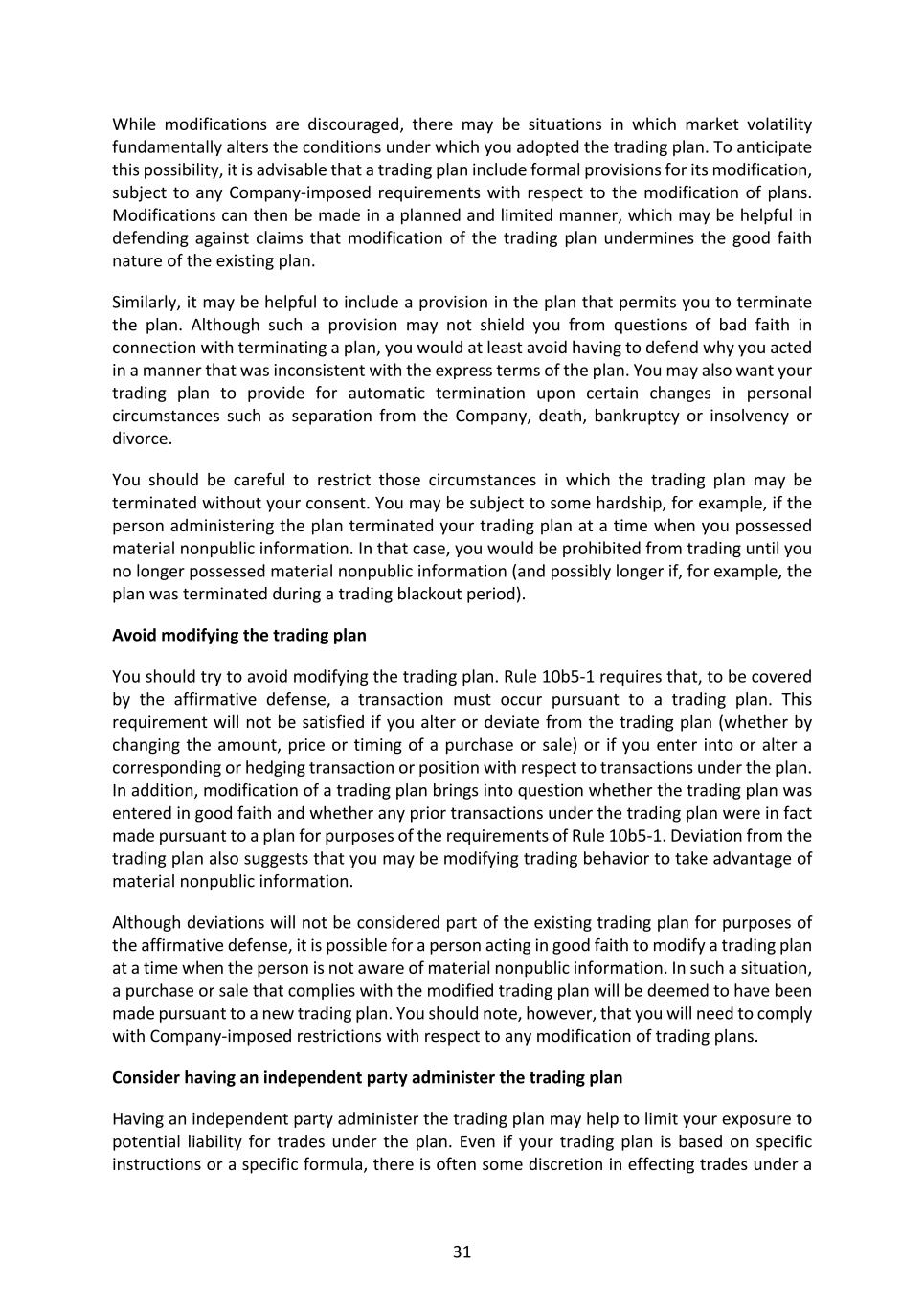 31 While modifications are discouraged, there may be situations in which market volatility fundamentally alters the conditions under which you adopted the trading plan. To anticipate this possibility, it is advisable that a trading plan include formal provisions for its modification, subject to any Company-imposed requirements with respect to the modification of plans. Modifications can then be made in a planned and limited manner, which may be helpful in defending against claims that modification of the trading plan undermines the good faith nature of the existing plan. Similarly, it may be helpful to include a provision in the plan that permits you to terminate the plan. Although such a provision may not shield you from questions of bad faith in connection with terminating a plan, you would at least avoid having to defend why you acted in a manner that was inconsistent with the express terms of the plan. You may also want your trading plan to provide for automatic termination upon certain changes in personal circumstances such as separation from the Company, death, bankruptcy or insolvency or divorce. You should be careful to restrict those circumstances in which the trading plan may be terminated without your consent. You may be subject to some hardship, for example, if the person administering the plan terminated your trading plan at a time when you possessed material nonpublic information. In that case, you would be prohibited from trading until you no longer possessed material nonpublic information (and possibly longer if, for example, the plan was terminated during a trading blackout period). Avoid modifying the trading plan You should try to avoid modifying the trading plan. Rule 10b5-1 requires that, to be covered by the affirmative defense, a transaction must occur pursuant to a trading plan. This requirement will not be satisfied if you alter or deviate from the trading plan (whether by changing the amount, price or timing of a purchase or sale) or if you enter into or alter a corresponding or hedging transaction or position with respect to transactions under the plan. In addition, modification of a trading plan brings into question whether the trading plan was entered in good faith and whether any prior transactions under the trading plan were in fact made pursuant to a plan for purposes of the requirements of Rule 10b5-1. Deviation from the trading plan also suggests that you may be modifying trading behavior to take advantage of material nonpublic information. Although deviations will not be considered part of the existing trading plan for purposes of the affirmative defense, it is possible for a person acting in good faith to modify a trading plan at a time when the person is not aware of material nonpublic information. In such a situation, a purchase or sale that complies with the modified trading plan will be deemed to have been made pursuant to a new trading plan. You should note, however, that you will need to comply with Company-imposed restrictions with respect to any modification of trading plans. Consider having an independent party administer the trading plan Having an independent party administer the trading plan may help to limit your exposure to potential liability for trades under the plan. Even if your trading plan is based on specific instructions or a specific formula, there is often some discretion in effecting trades under a