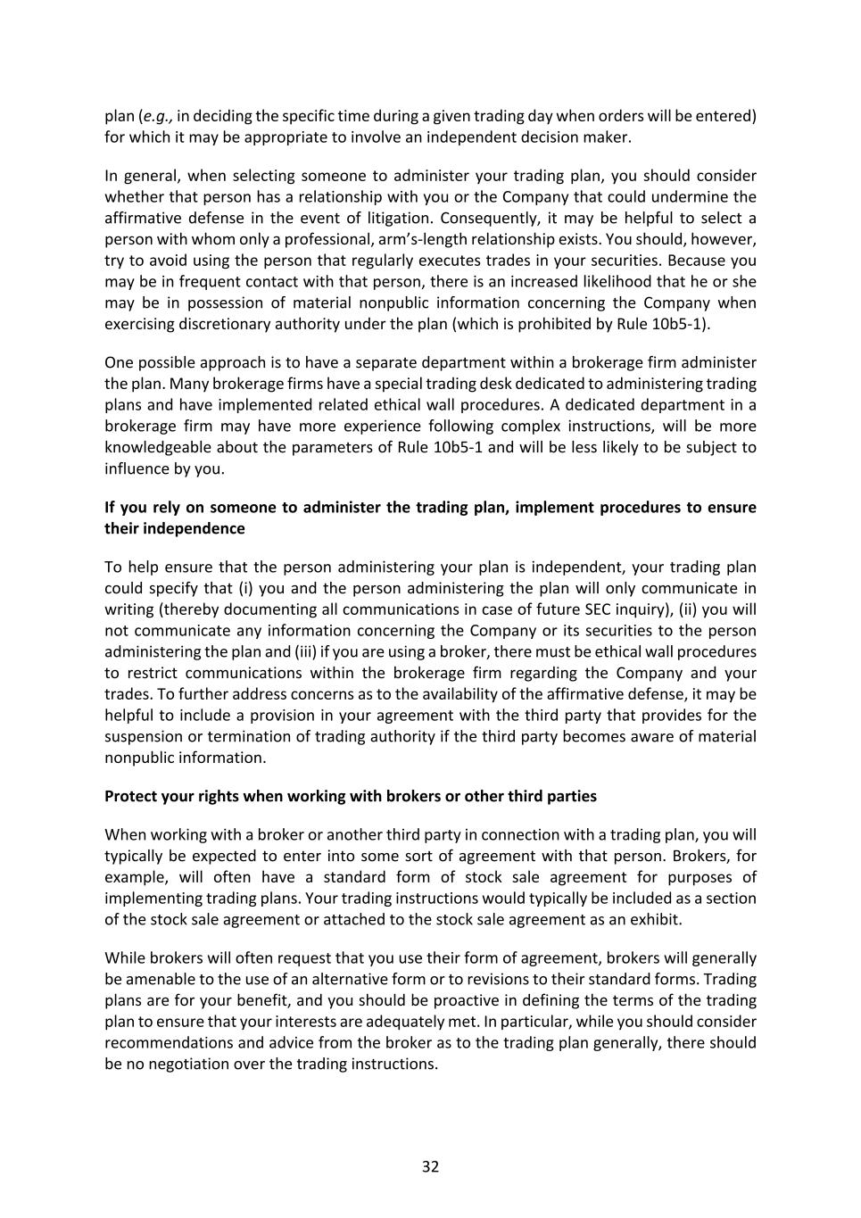 32 plan (e.g., in deciding the specific time during a given trading day when orders will be entered) for which it may be appropriate to involve an independent decision maker. In general, when selecting someone to administer your trading plan, you should consider whether that person has a relationship with you or the Company that could undermine the affirmative defense in the event of litigation. Consequently, it may be helpful to select a person with whom only a professional, arm’s-length relationship exists. You should, however, try to avoid using the person that regularly executes trades in your securities. Because you may be in frequent contact with that person, there is an increased likelihood that he or she may be in possession of material nonpublic information concerning the Company when exercising discretionary authority under the plan (which is prohibited by Rule 10b5-1). One possible approach is to have a separate department within a brokerage firm administer the plan. Many brokerage firms have a special trading desk dedicated to administering trading plans and have implemented related ethical wall procedures. A dedicated department in a brokerage firm may have more experience following complex instructions, will be more knowledgeable about the parameters of Rule 10b5-1 and will be less likely to be subject to influence by you. If you rely on someone to administer the trading plan, implement procedures to ensure their independence To help ensure that the person administering your plan is independent, your trading plan could specify that (i) you and the person administering the plan will only communicate in writing (thereby documenting all communications in case of future SEC inquiry), (ii) you will not communicate any information concerning the Company or its securities to the person administering the plan and (iii) if you are using a broker, there must be ethical wall procedures to restrict communications within the brokerage firm regarding the Company and your trades. To further address concerns as to the availability of the affirmative defense, it may be helpful to include a provision in your agreement with the third party that provides for the suspension or termination of trading authority if the third party becomes aware of material nonpublic information. Protect your rights when working with brokers or other third parties When working with a broker or another third party in connection with a trading plan, you will typically be expected to enter into some sort of agreement with that person. Brokers, for example, will often have a standard form of stock sale agreement for purposes of implementing trading plans. Your trading instructions would typically be included as a section of the stock sale agreement or attached to the stock sale agreement as an exhibit. While brokers will often request that you use their form of agreement, brokers will generally be amenable to the use of an alternative form or to revisions to their standard forms. Trading plans are for your benefit, and you should be proactive in defining the terms of the trading plan to ensure that your interests are adequately met. In particular, while you should consider recommendations and advice from the broker as to the trading plan generally, there should be no negotiation over the trading instructions.