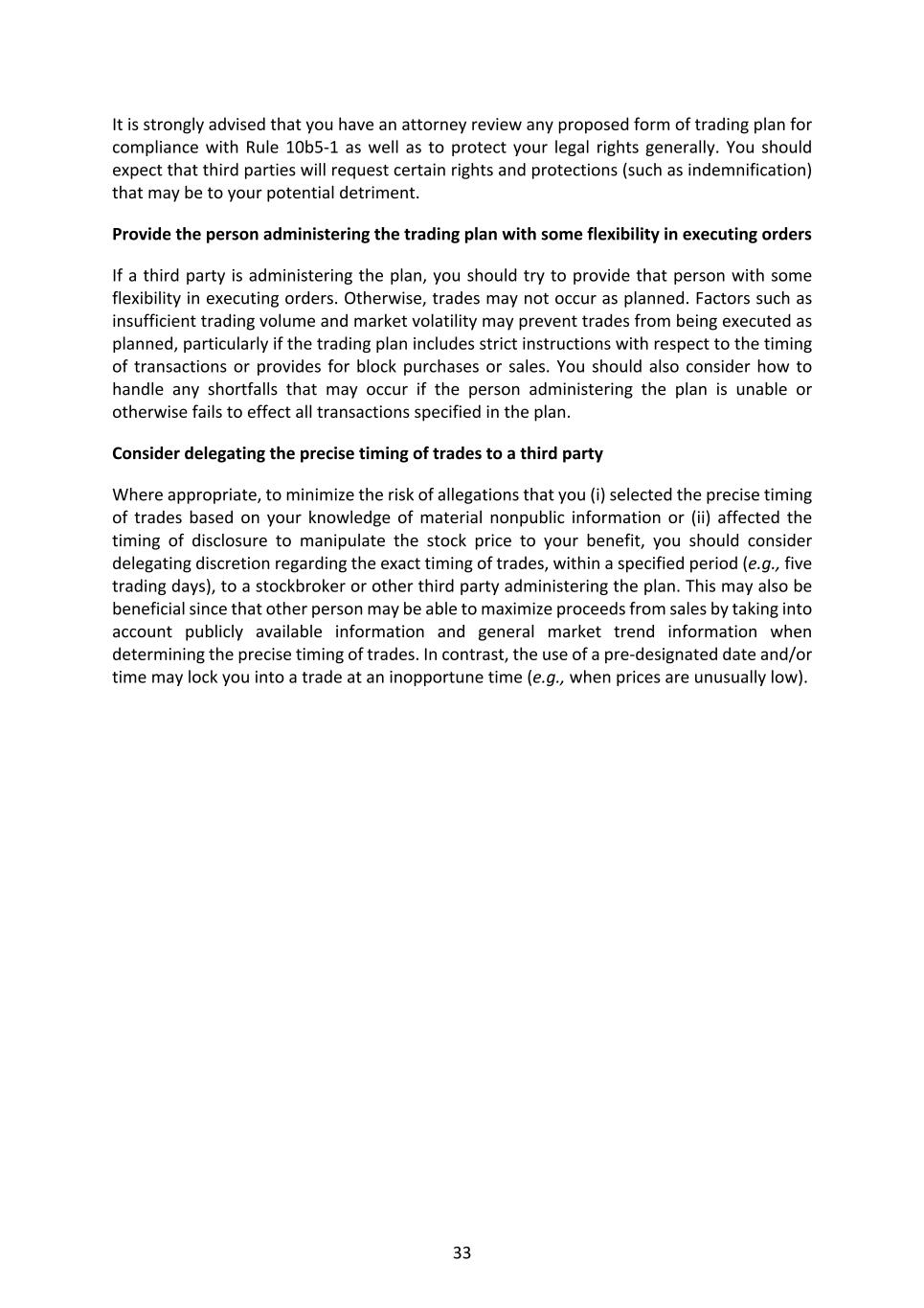 33 It is strongly advised that you have an attorney review any proposed form of trading plan for compliance with Rule 10b5-1 as well as to protect your legal rights generally. You should expect that third parties will request certain rights and protections (such as indemnification) that may be to your potential detriment. Provide the person administering the trading plan with some flexibility in executing orders If a third party is administering the plan, you should try to provide that person with some flexibility in executing orders. Otherwise, trades may not occur as planned. Factors such as insufficient trading volume and market volatility may prevent trades from being executed as planned, particularly if the trading plan includes strict instructions with respect to the timing of transactions or provides for block purchases or sales. You should also consider how to handle any shortfalls that may occur if the person administering the plan is unable or otherwise fails to effect all transactions specified in the plan. Consider delegating the precise timing of trades to a third party Where appropriate, to minimize the risk of allegations that you (i) selected the precise timing of trades based on your knowledge of material nonpublic information or (ii) affected the timing of disclosure to manipulate the stock price to your benefit, you should consider delegating discretion regarding the exact timing of trades, within a specified period (e.g., five trading days), to a stockbroker or other third party administering the plan. This may also be beneficial since that other person may be able to maximize proceeds from sales by taking into account publicly available information and general market trend information when determining the precise timing of trades. In contrast, the use of a pre-designated date and/or time may lock you into a trade at an inopportune time (e.g., when prices are unusually low).