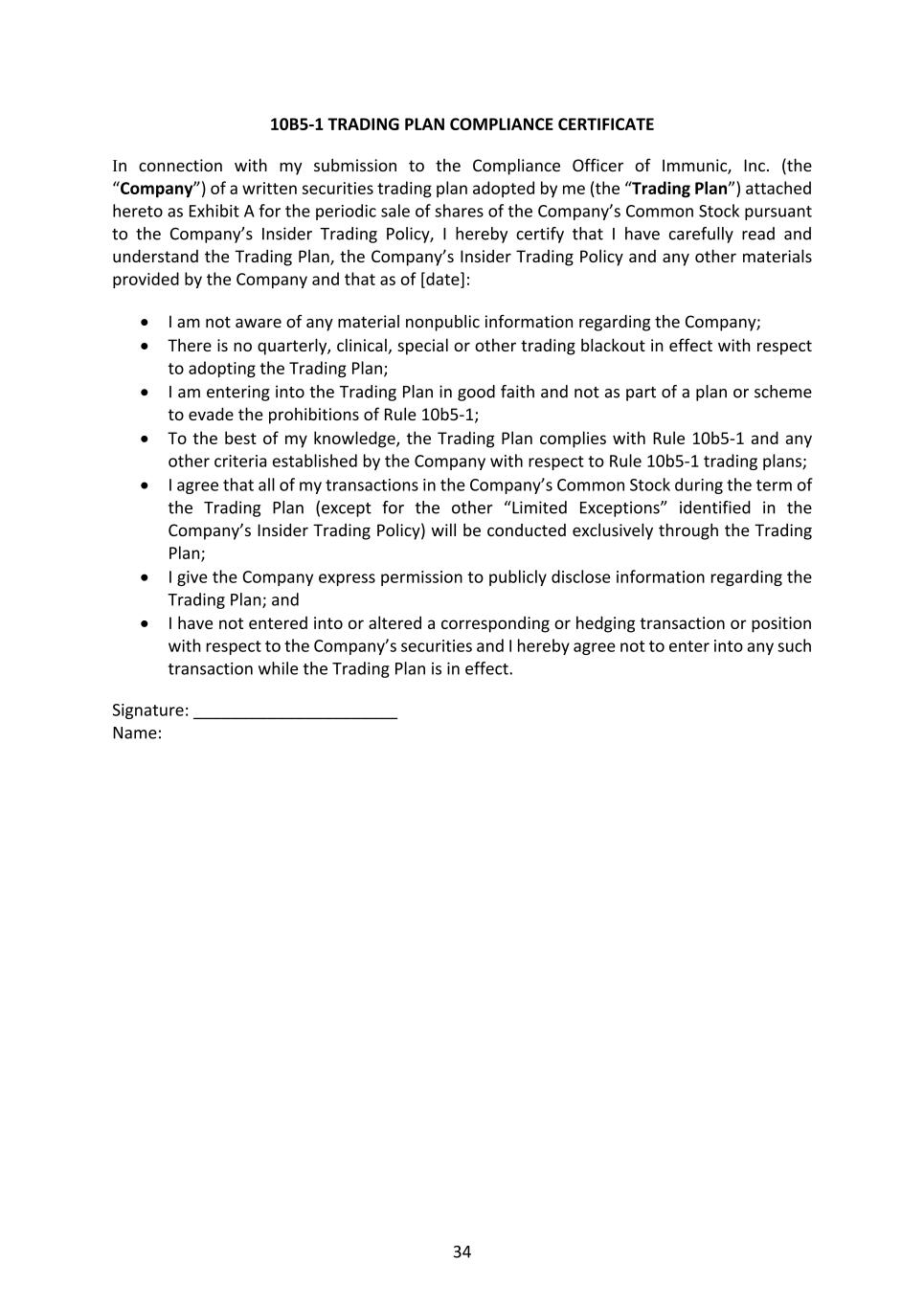 34 10B5-1 TRADING PLAN COMPLIANCE CERTIFICATE In connection with my submission to the Compliance Officer of Immunic, Inc. (the “Company”) of a written securities trading plan adopted by me (the “Trading Plan”) attached hereto as Exhibit A for the periodic sale of shares of the Company’s Common Stock pursuant to the Company’s Insider Trading Policy, I hereby certify that I have carefully read and understand the Trading Plan, the Company’s Insider Trading Policy and any other materials provided by the Company and that as of [date]: • I am not aware of any material nonpublic information regarding the Company; • There is no quarterly, clinical, special or other trading blackout in effect with respect to adopting the Trading Plan; • I am entering into the Trading Plan in good faith and not as part of a plan or scheme to evade the prohibitions of Rule 10b5-1; • To the best of my knowledge, the Trading Plan complies with Rule 10b5-1 and any other criteria established by the Company with respect to Rule 10b5-1 trading plans; • I agree that all of my transactions in the Company’s Common Stock during the term of the Trading Plan (except for the other “Limited Exceptions” identified in the Company’s Insider Trading Policy) will be conducted exclusively through the Trading Plan; • I give the Company express permission to publicly disclose information regarding the Trading Plan; and • I have not entered into or altered a corresponding or hedging transaction or position with respect to the Company’s securities and I hereby agree not to enter into any such transaction while the Trading Plan is in effect. Signature: ______________________ Name:
