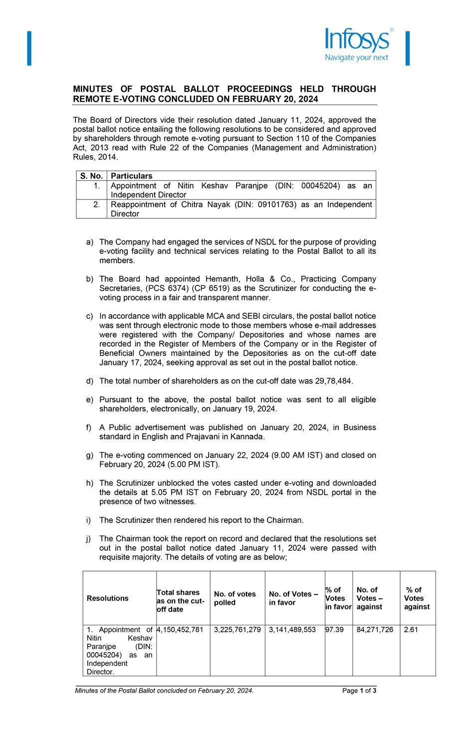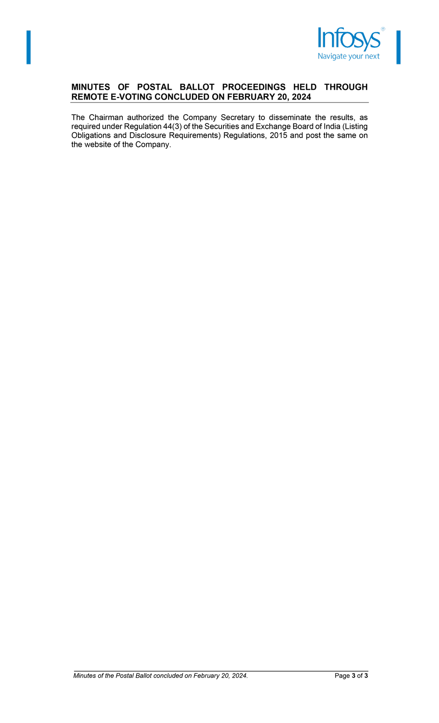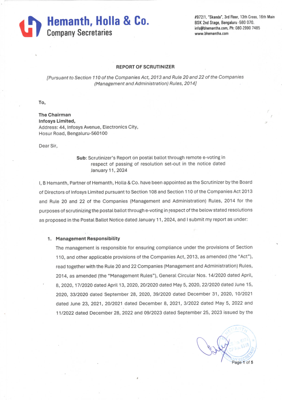Infosys Limited, a company organized under the laws of the Republic of India ("Infosys", or the "Company"), hereby furnishes with the United States Securities and Exchange Commission, the copy of the Postal Ballot voting results, scrutinizer’s report and minutes of the proceedings of the Postal Ballot concluded on February 20, 2024.