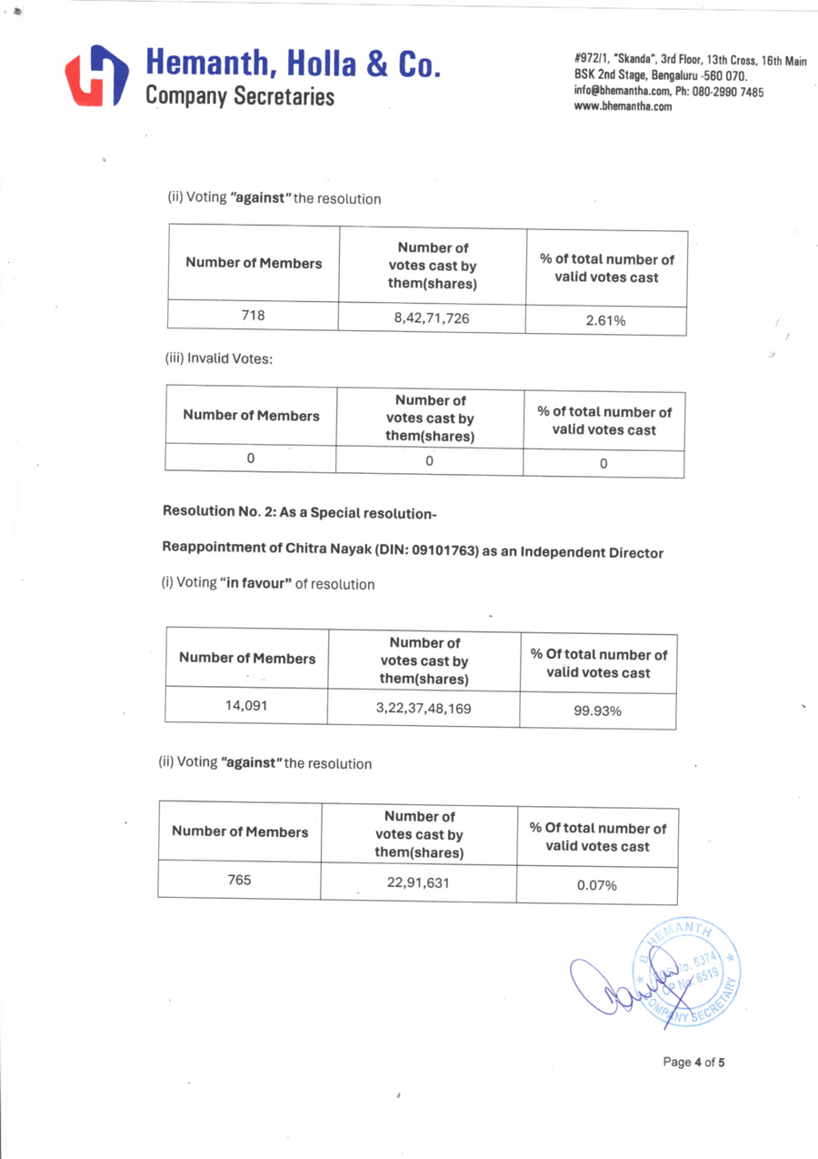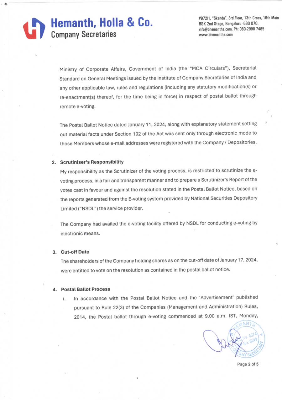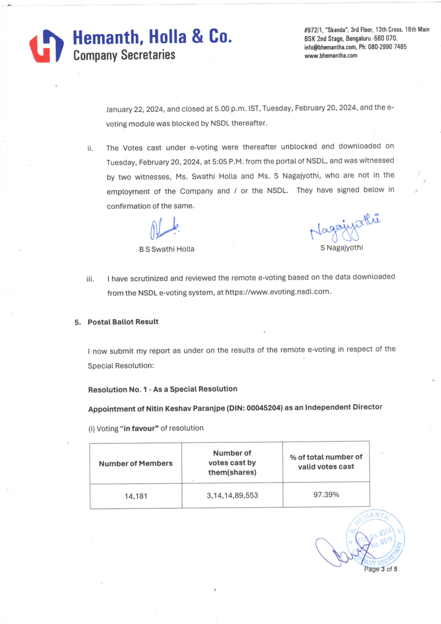 As per the Indian Companies Act, 2013, the Company provided its members the facility to cast their votes by electronic means (“E-voting”) for all resolutions. The e-voting period commenced on January 22, 2024 9:00 hours (IST) and ended on February 20, 2024 17:00 hours (IST).