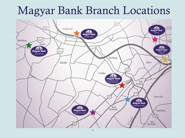 Magyar Bancorp, Inc. Overview ▪ Magyar Bank, a New Jersey chartered savings bank originally founded in 1922, is the wholly owned subsidiary of Magyar Bancorp, Inc. ▪ Magyar Bancorp, Inc., trades on NASDAQ under the symbol MGYR. ▪ As of December 31, 2023, we had $917 million in total assets, $729 million in loans, $764 million in deposits and $107 million in stockholders’ equity. ▪ Magyar Bank conducts its business from its main office in New Brunswick and six additional branch offices located in North Brunswick, South Brunswick, Branchburg, Bridgewater, and two in Edison, New Jersey. 3