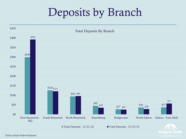 Deposits by Branch Totals exclude brokered deposits . $299 $126 $94 $45 $27 $36 $37 $392 $121 $96 $35 $25 $28 $57 $0 $50 $100 $150 $200 $250 $300 $350 $400 $450 New Brunswick - HQ South Brunswick North Brunswick Branchburg Bridgewater North Edison Edison - Tano Mall Total Deposits By Branch Total Deposits - 12/31/22 Total Deposits - 12/31/23