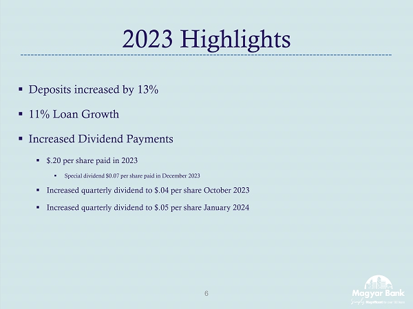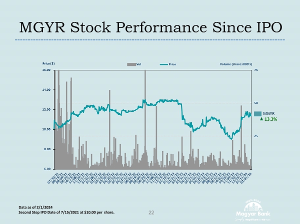 MGYR Stock Performance Since IPO 22 Data as of 2/1/2024 Second Step IPO Date of 7/15/2021 at $10.00 per share. MGYR 13.3% 6 . 0 0 8 . 0 0 10 . 0 0 12 . 0 0 14 . 0 0 16 . 0 0 2 5 5 0 7 5 Price ($) Volume (shares 000's) V o l P r i c e