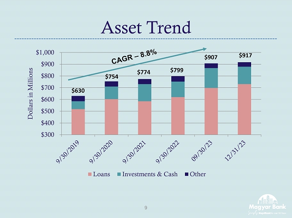 Asset Trend $300 $400 $500 $600 $700 $800 $900 $1,000 Dollars in Millions Loans Investments & Cash Other $630 $774 $907 $799 $754 9 $917