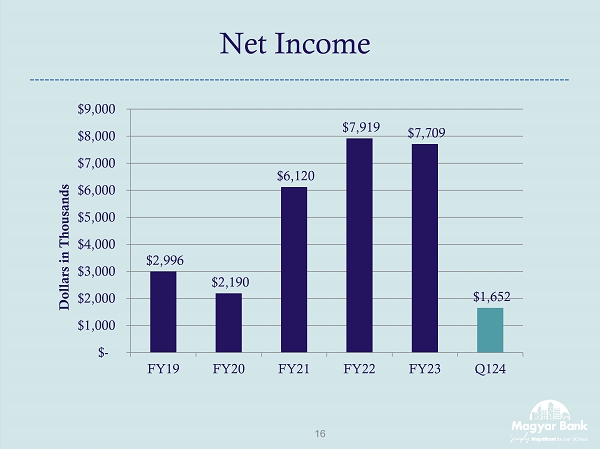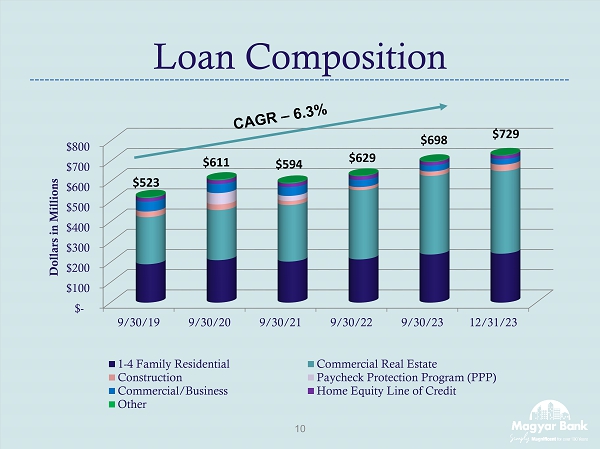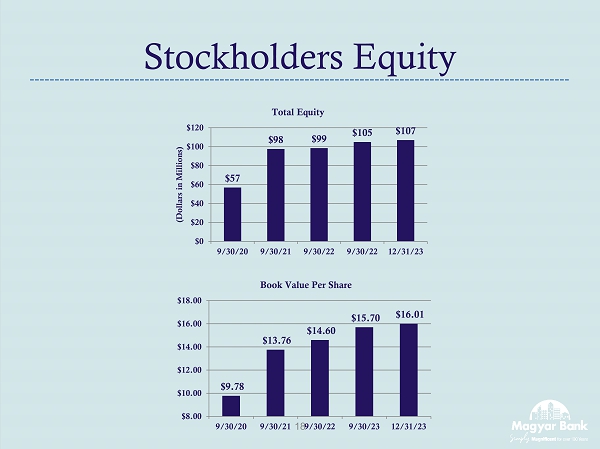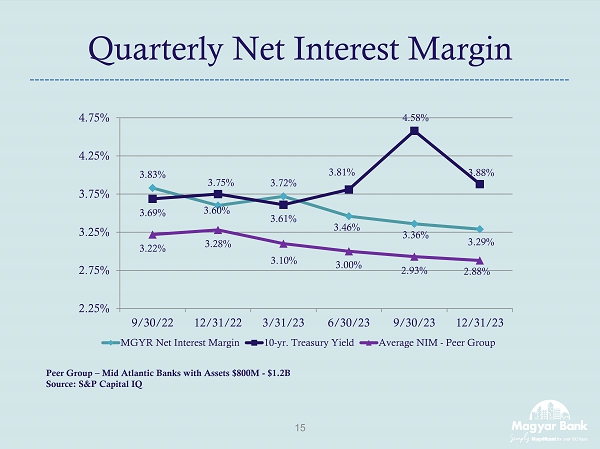 Quarterly Net Interest Margin 3.83% 3.60% 3.72% 3.46% 3.36% 3.29% 3.69% 3.75% 3.61% 3.81% 4.58% 3.88% 3.22% 3.28% 3.10% 3.00% 2.93% 2.88% 2.25% 2.75% 3.25% 3.75% 4.25% 4.75% 9/30/22 12/31/22 3/31/23 6/30/23 9/30/23 12/31/23 MGYR Net Interest Margin 10-yr. Treasury Yield Average NIM - Peer Group 15 Peer Group – Mid Atlantic Banks with Assets $800M - $1.2B Source: S&P Capital IQ