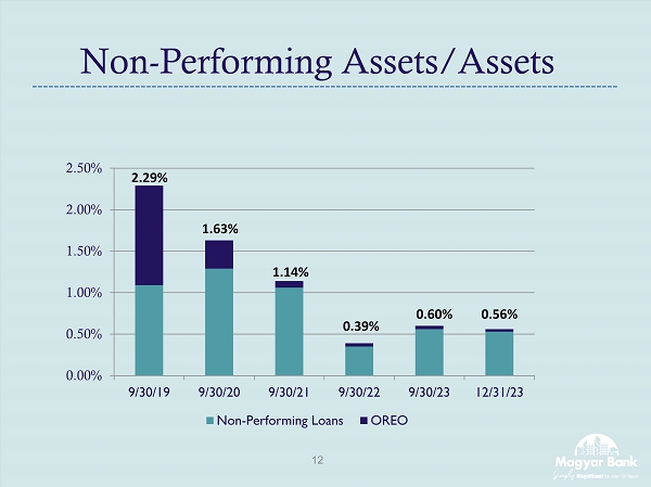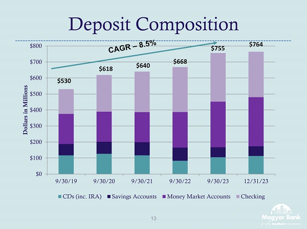 Non - Performing Assets/Assets 0.00% 0.50% 1.00% 1.50% 2.00% 2.50% 9/30/19 9/30/20 9/30/21 9/30/22 9/30/23 12/31/23 Non-Performing Loans OREO 1.63% 12 2.29% 0.60% 0.39% 1.14% 0.56%