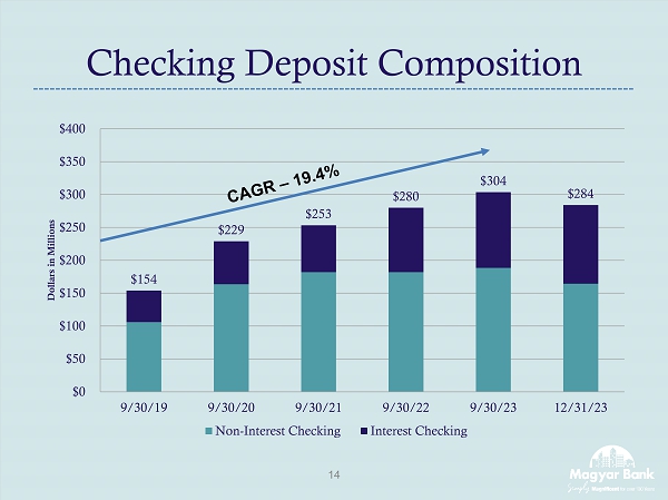 Deposit Composition $0 $100 $200 $300 $400 $500 $600 $700 $800 9/30/19 9/30/20 9/30/21 9/30/22 9/30/23 12/31/23 Dollars in Millions CDs (inc. IRA) Savings Accounts Money Market Accounts Checking 13 $618 $640 $668 $755 $764 $530