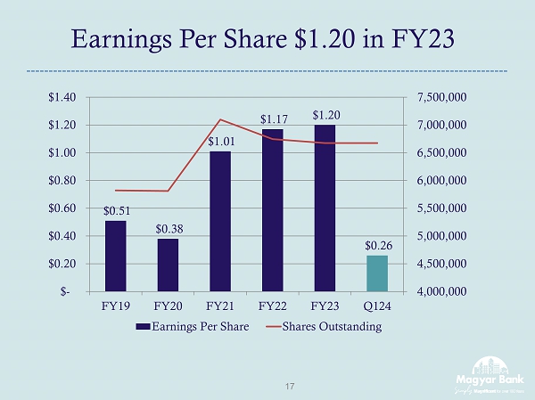 Net Income $2,996 $2,190 $6,120 $7,919 $7,709 $1,652 $- $1,000 $2,000 $3,000 $4,000 $5,000 $6,000 $7,000 $8,000 $9,000 FY19 FY20 FY21 FY22 FY23 Q124 Dollars in Thousands 16