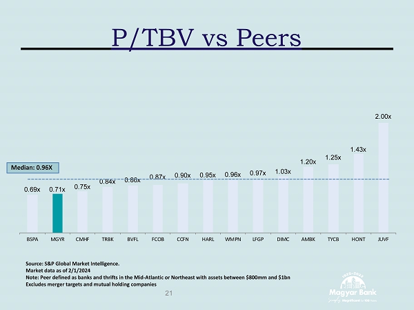 ( 25 % ) ( 30 % ) ( 35 % ) ( 40 % ) ( 20 % ) ( 15 % ) 15% 10% 5% 0% (5%) ( 10 % ) 2 / 1 / 23 4 / 1 / 23 6 / 1 / 23 8 / 1 / 23 10 / 1 / 23 12 / 1 / 23 2 / 1 / 24 MGYR LTM Stock Performance 20 Data as of 2/1/2024 MGYR 11.93% KRX 16.03%